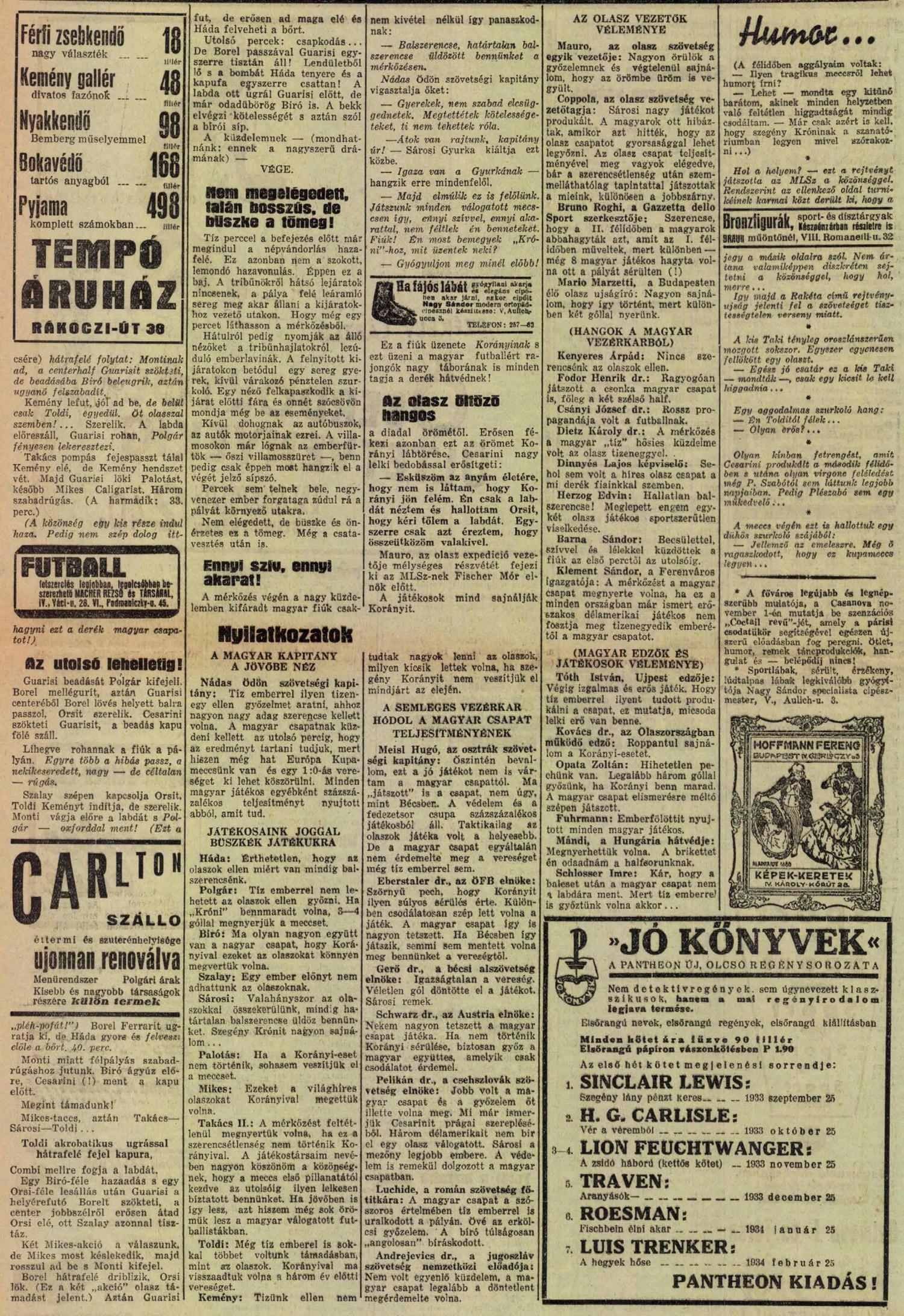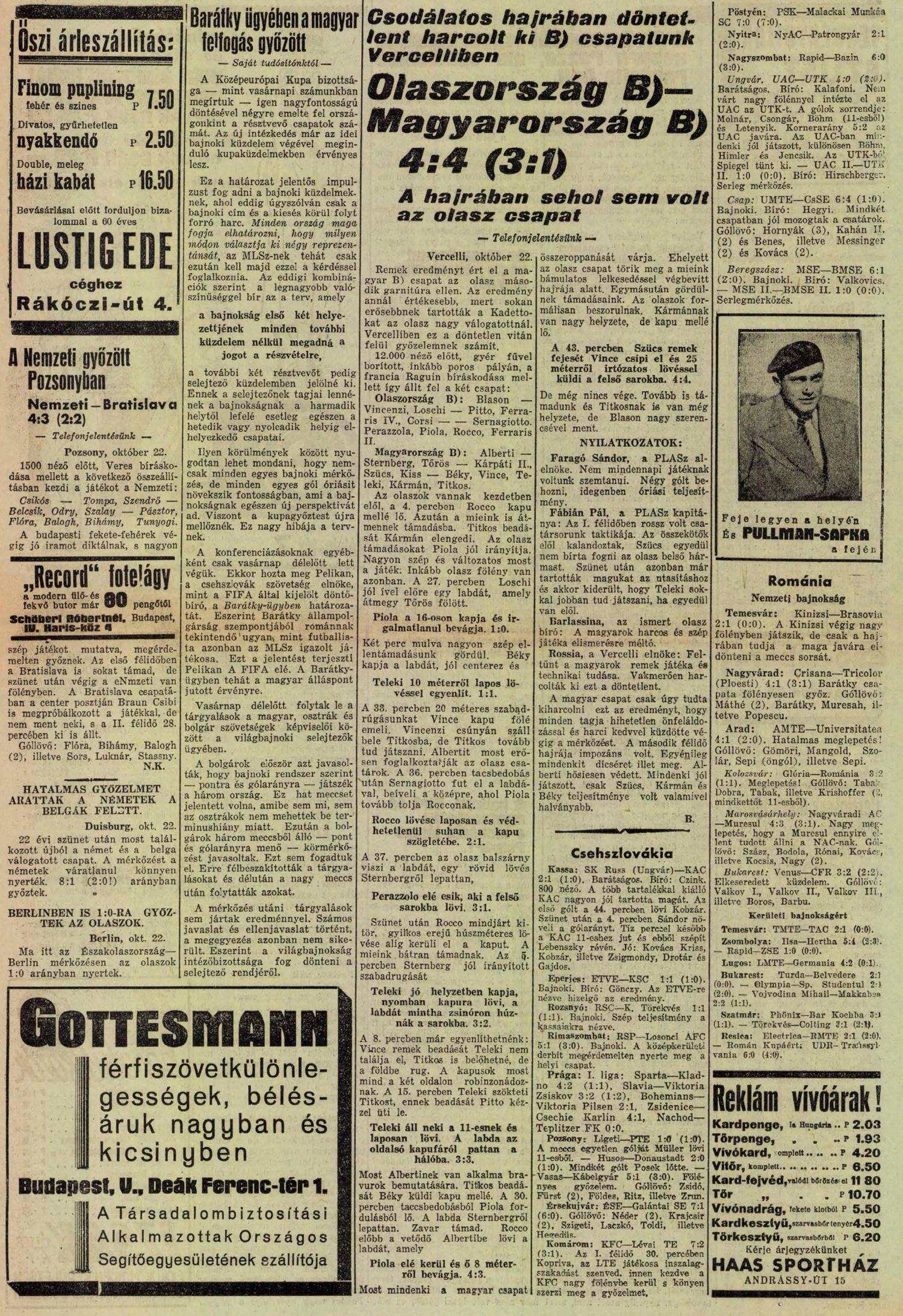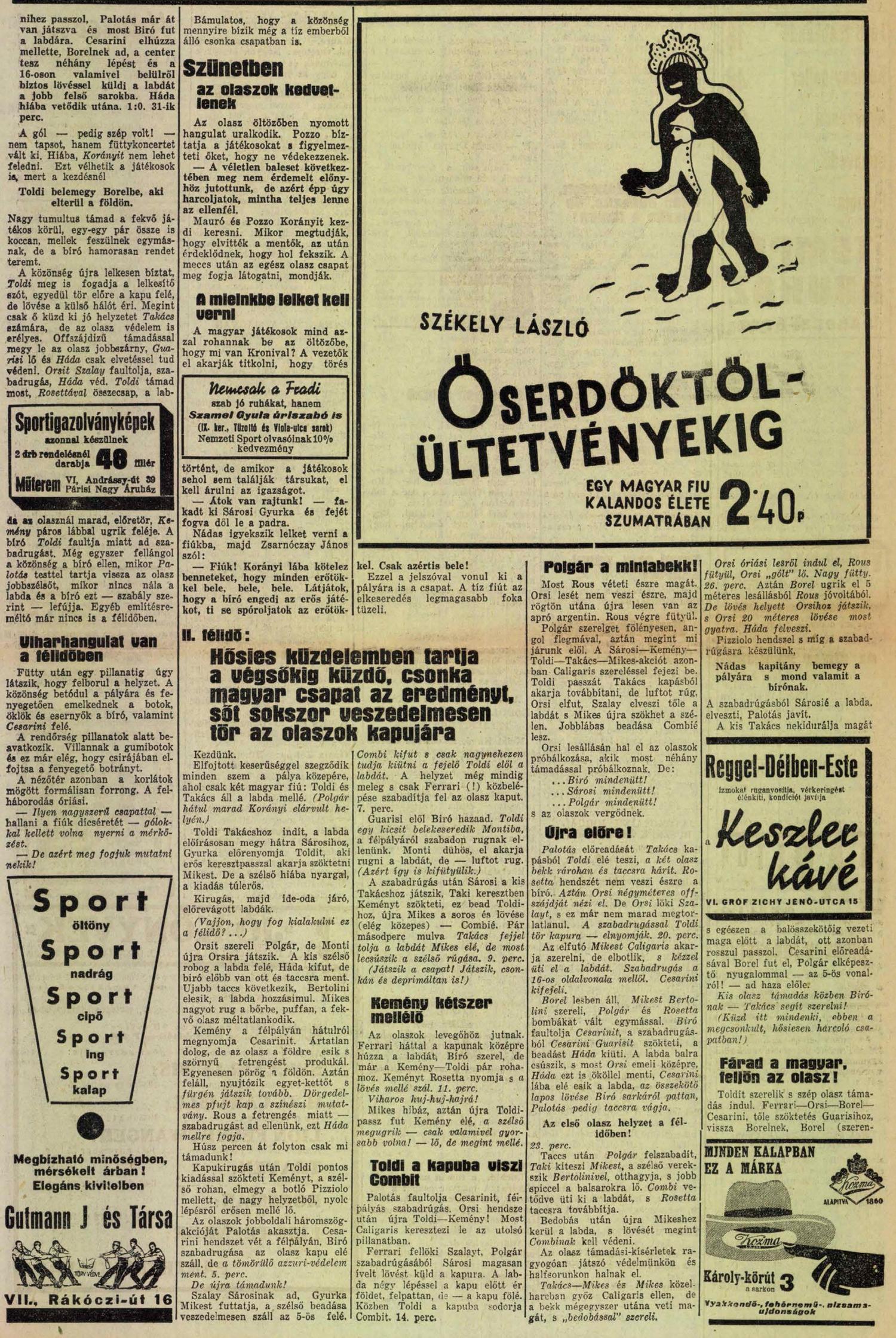 1933. október 22. MAGYARORSZÁG—OLASZORSZÁG 0:1 (0:1)