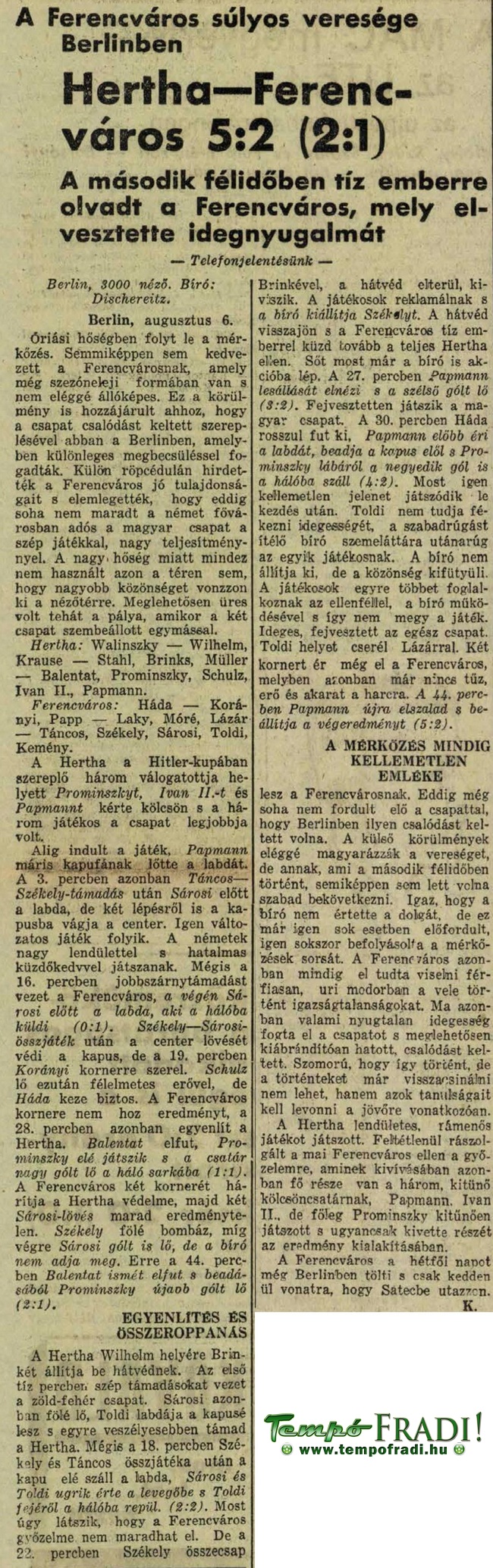 1933.VIII.6. Hertha – Ferencváros 5:2