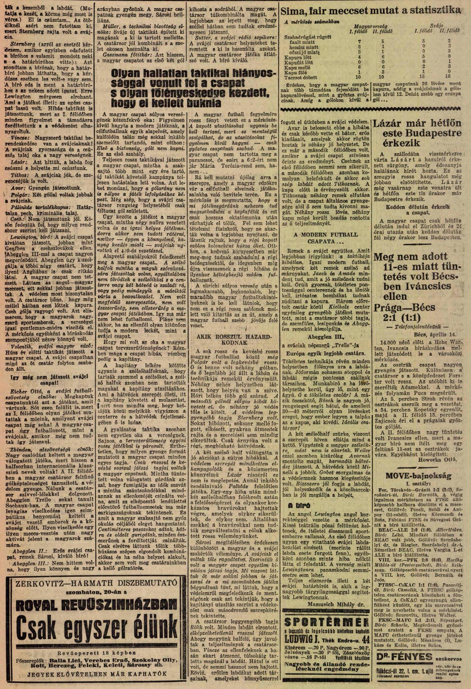Magyarország: Hóri (Újpest — Polgár (Ferencváros), Sternberg (Újpest) — Palotás (Bocskai), Sárosi (Ferencváros), Lázár (Ferencváros) — Rökk (Budai 11), Vincze (Újpest), Avar (Újpest), Cseh II (Hungária), Titkos (Hungária)