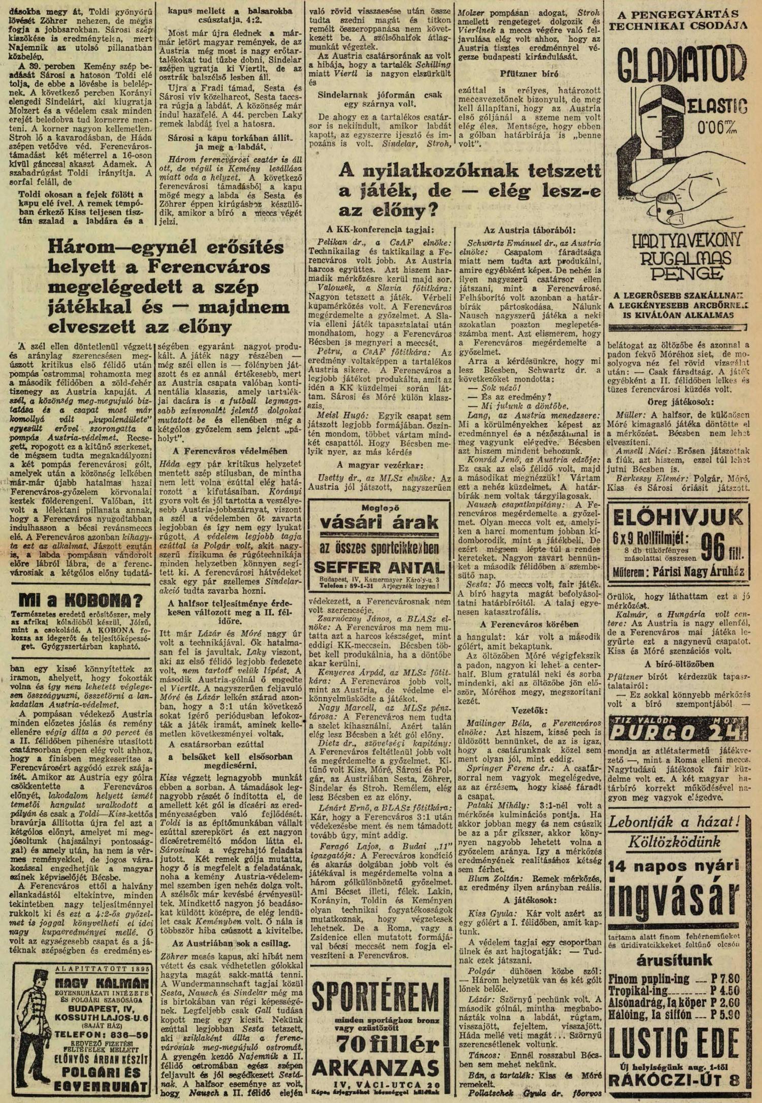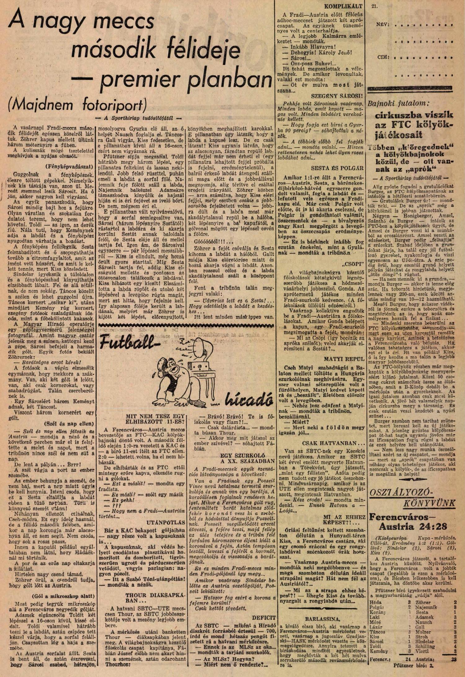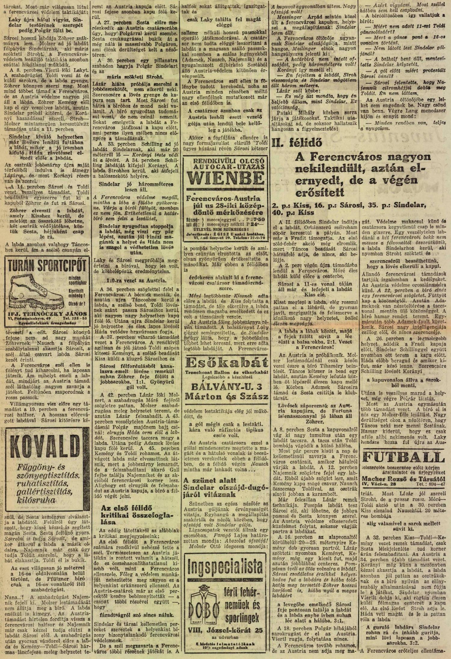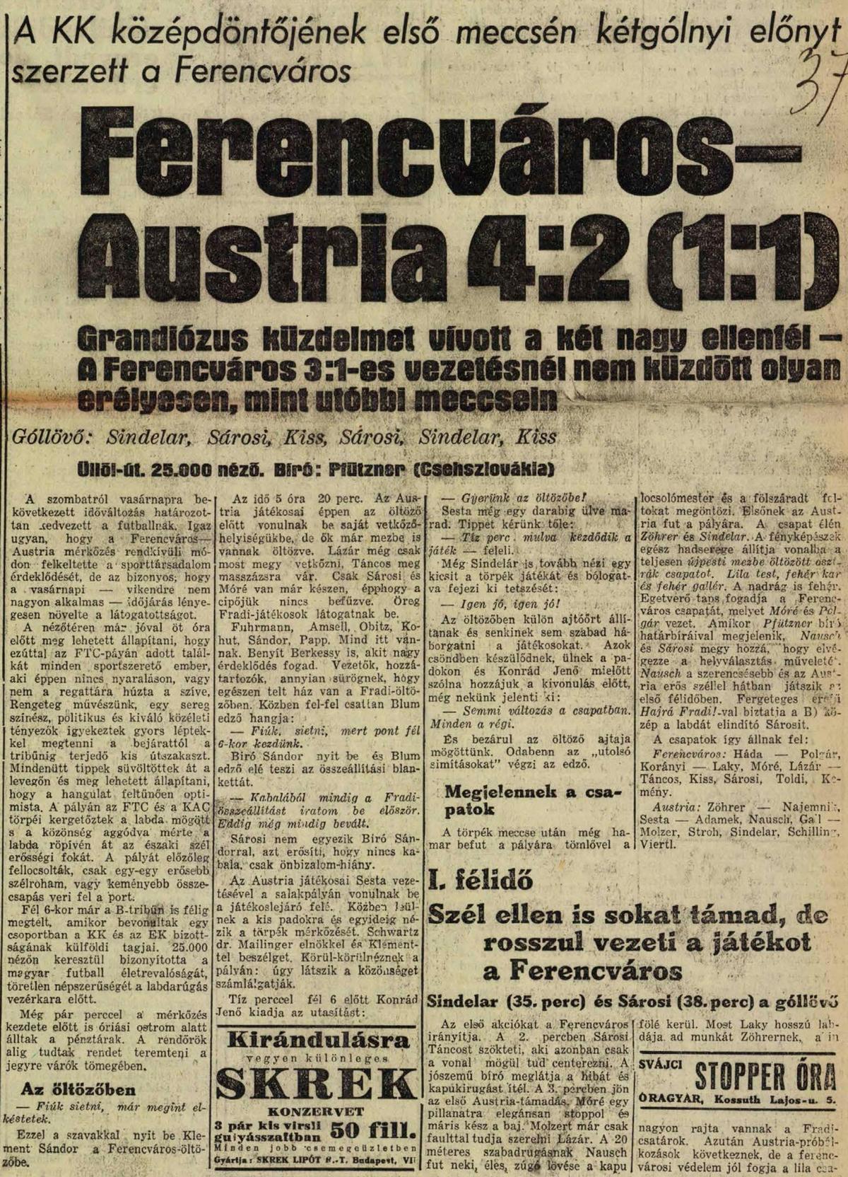 1935.VII.21. KK, Ferencváros – Austria 4:2 Közzétéve: 2009. február 4. szerda | Szerző: K@rcsi A KK középdöntőjének első meccsén kétgólnyi előnyt szerzett a Ferencváros Grandiózus küzdelmet vívott a két nagy ellenfél — A Ferencváros 3:1-es vezetésnél nem küzdött olyan erélyesen, mint utóbbi meccsein Vélemény, hozzászólás? Válasz megszakításaAz e-mail címet nem tesszük közzé. A kötelező mezőket * karakterrel jelöltük Hozzászólás * Név * E-mail cím * Honlap Δ