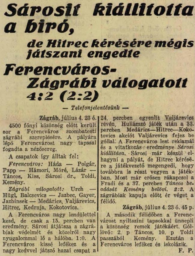 1936.VII.4. Zágráb válogatott – Ferencváros 2:4