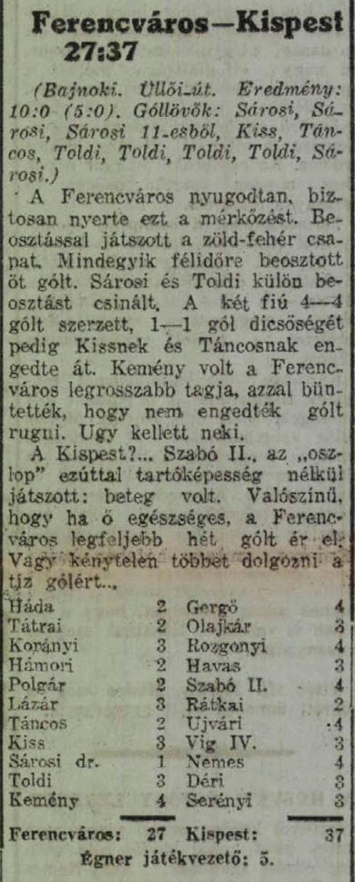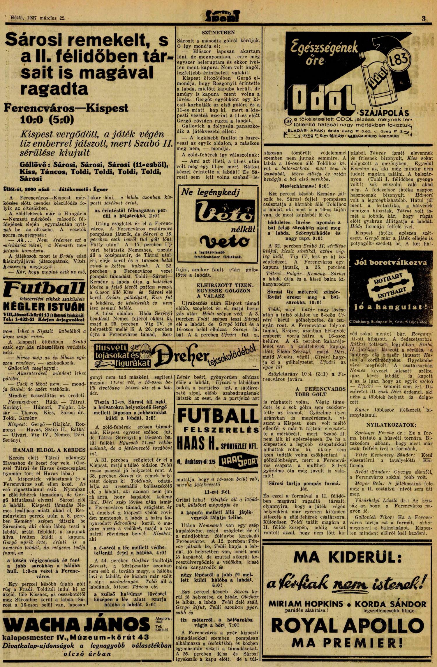 1937.III.21. Kispest – Ferencváros 0:10 Közzétéve: 2009. február 6. péntek | Szerző: K@rcsi Sárosi remekelt, s a II. félidőben társait is magával ragadta Egy hozzászólás a(z) 11110010001ejegyzéshez Takács Gábor on 2018. március 21. szerda - 07:31 EZ AZTÁN A KÜLÖNBSLG !!! Vélemény, hozzászólás? Válasz megszakításaAz e-mail címet nem tesszük közzé. A kötelező mezőket * karakterrel jelöltük Hozzászólás * Név * E-mail cím * Honlap Δ