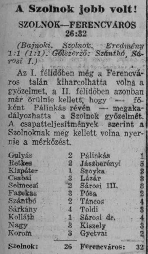 Nagy volt a készülődés a meccs előtt, a hazai vezetők meg is lepődtek, hogy a Fradi játékosait csak 150-200 néző kísérte el Szolnokra. Olvasva az akkori Nemzeti Sport beszámolóját a mérkőzésről, a gyors gólokon kívül a 42. percben történteken kaptam fel a fejem: „Toldi véletlenül fejbe rúgta Kispétert, akinek a homlokán felrepedt a bőre.” Az első reakcióm az volt, hogy vajon Toldi milyen szituációban rúghatta fejbe Kispétert? Talán egy szögletnél Kispéter fejjel akarta, Toldi meg ollózva akarta bevenni a szolnoki kaput? Elég volt ránéznem a két csapat összeállítására és egyből szembeötlött a megoldás. 1939-ben Kispéter Mihály, a Fradi legendás hátvédje még Szolnokon játszott, és csak 1947-ben csatlakozott a Ferencvároshoz, ahol tíz éven át szolgálta a zöld-fehéreket. 296 alkalommal lépett pályára, bajnoki és kupagyőzelmet is szerzett, és 1974-ben a Ferencváros örökös bajnoka címet kapott.