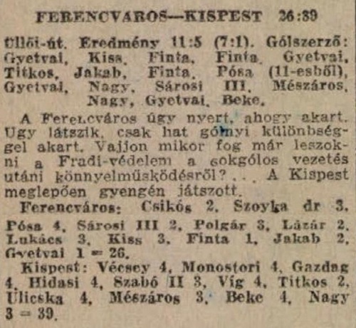 „A bajnoki mérkőzésnek szinte edzőmérkőzés jelleget adott az a körülmény, hogy mindkét csapatból hiányzott a küzdőszellem. Különösen az első félidőben a Kispest majdnem hagyta magát »letaglózni«. A Ferencváros gépszerű adogatásával kényére-kedvére vezette támadásait és érte el góljait. Ha nagyon rákapcsol, még tizet rúghatott volna. A Kispest csak a második félidőben kezdett játszani; a ferencvárosi védelem könnyelműségeit kihasználva ekkor még több gólt is lőhetett volna.