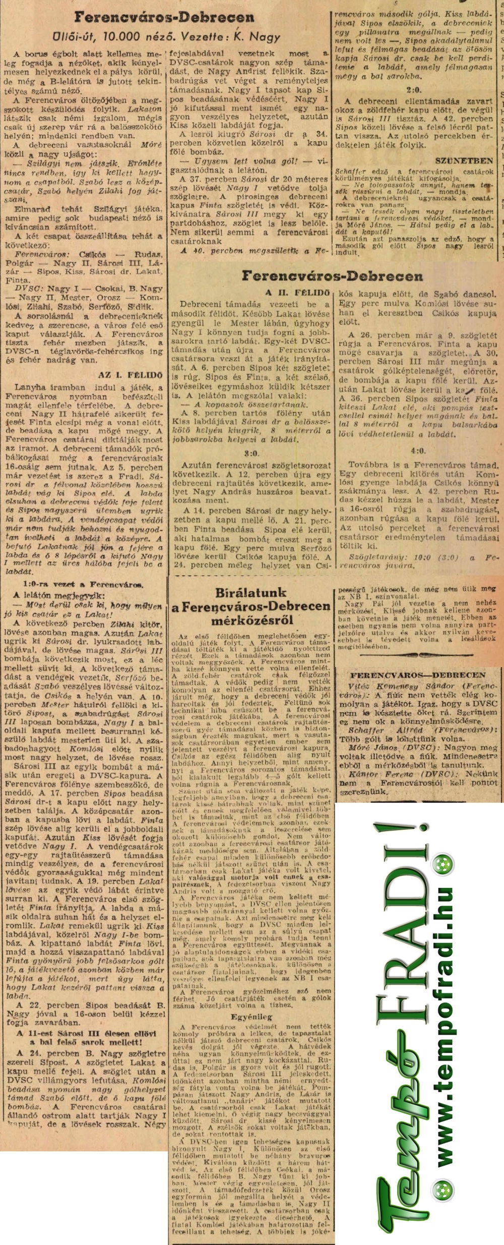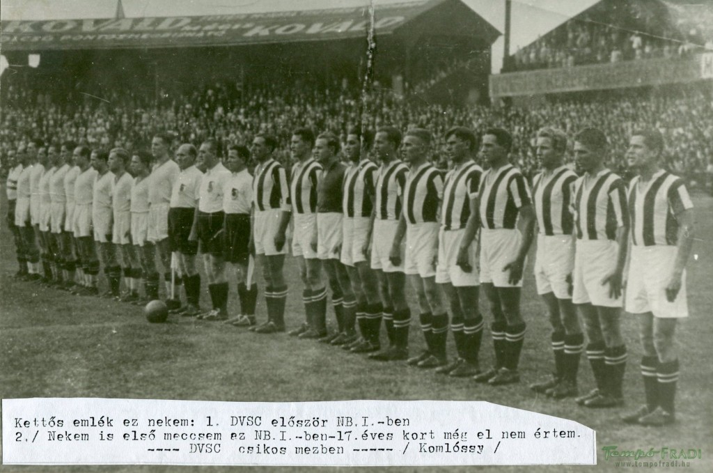 Még szerencse, hogy szerkesztőtársam statisztikája gyorsan rádöbbentett arra, hogy a Debrecennel eddig csak 78 alkalommal mértük össze az erőinket. Először még 1943. szeptember 5-én. A DVSC 1902-ben alakult, és eleinte főleg alacsonyabb osztályokban szerepelt. A profizmus 1926-os bevezetése sem tett jó a csapatnak, hiszen ezek után 1940-ig a Bocskai FC számított Debrecen első számú csapatának. Amikor anyagi problémák miatt megszűnt a klub, utána vette át a városi sportéletben a vezető szerepet a DVSC. 1942/43-ban nyerték meg az NB II-t, ezzel első alkalommal nyílt lehetőségük az első vonalban szerepelni, és 1943 őszén pályára lépni az Üllői úton a Ferencváros ellen.