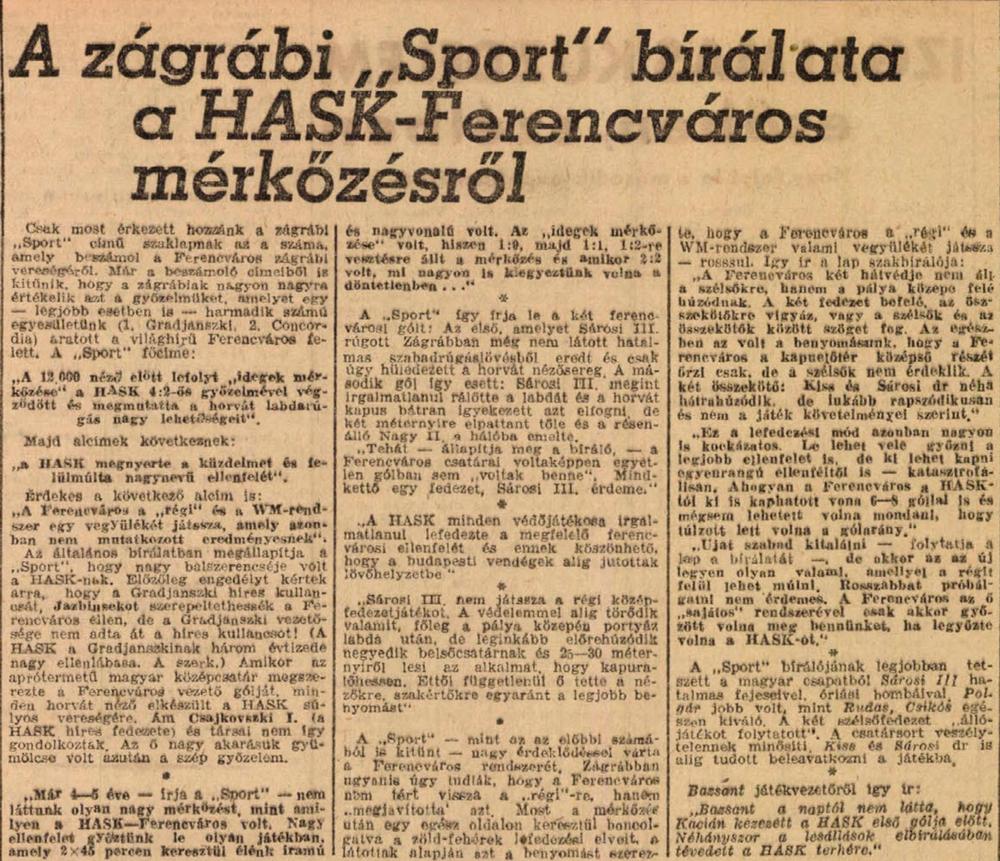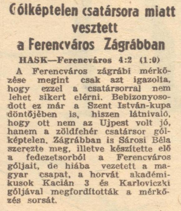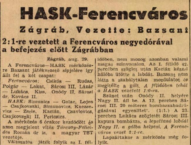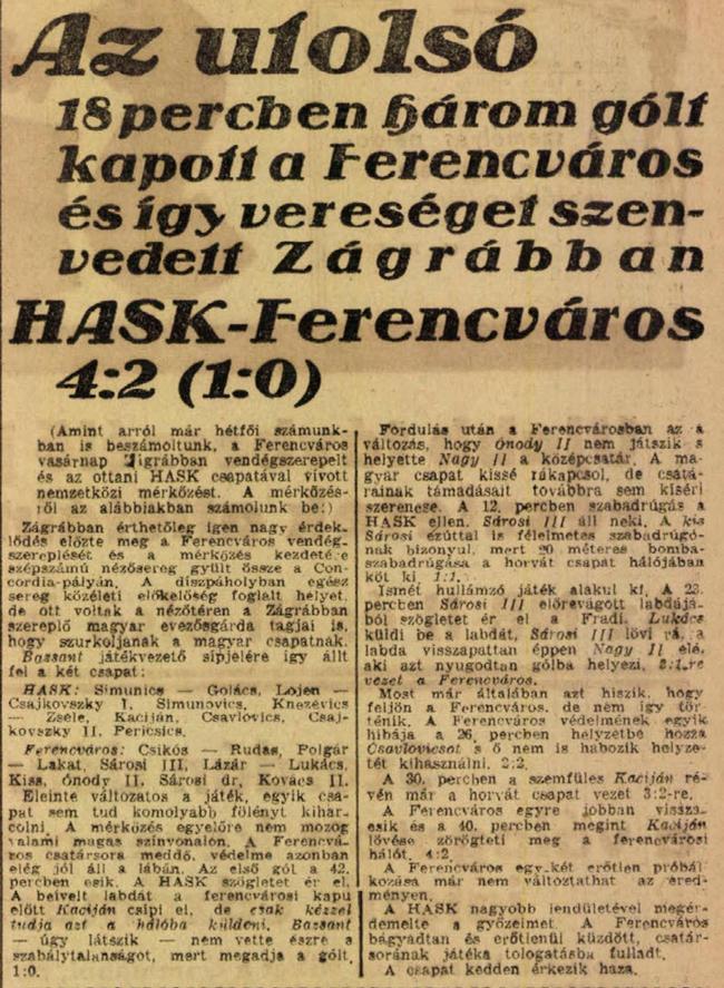 1943.VIII.29. HASK Zagreb – Ferencváros 4:2 Közzétéve: 2009. február 12. csütörtök | Szerző: mjozef22 Az utolsó 18 percben három gólt kapott a Ferencváros és így vereséget szenvedett Zágrábban Vélemény, hozzászólás? Válasz megszakításaAz e-mail címet nem tesszük közzé. A kötelező mezőket * karakterrel jelöltük Hozzászólás * Név * E-mail cím * Honlap Δ