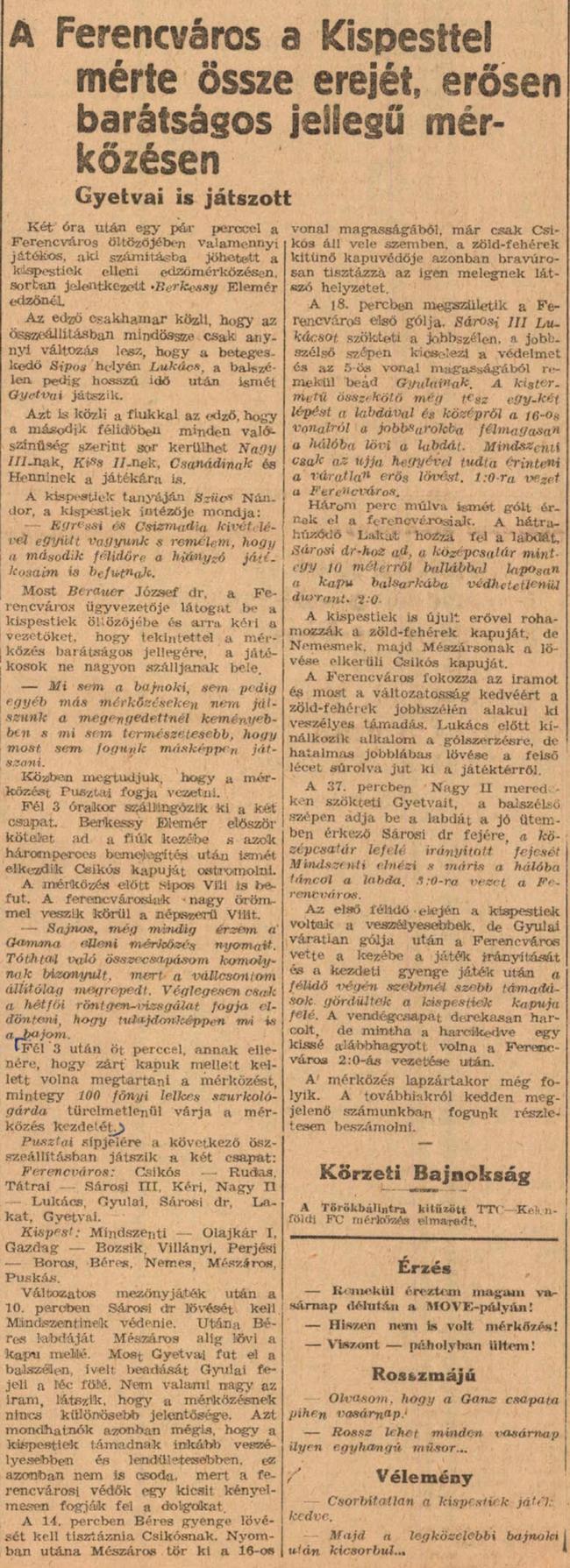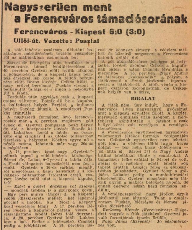 1944.X.22. Ferencváros – Kispest 6:0 (edzőmérkőzés)