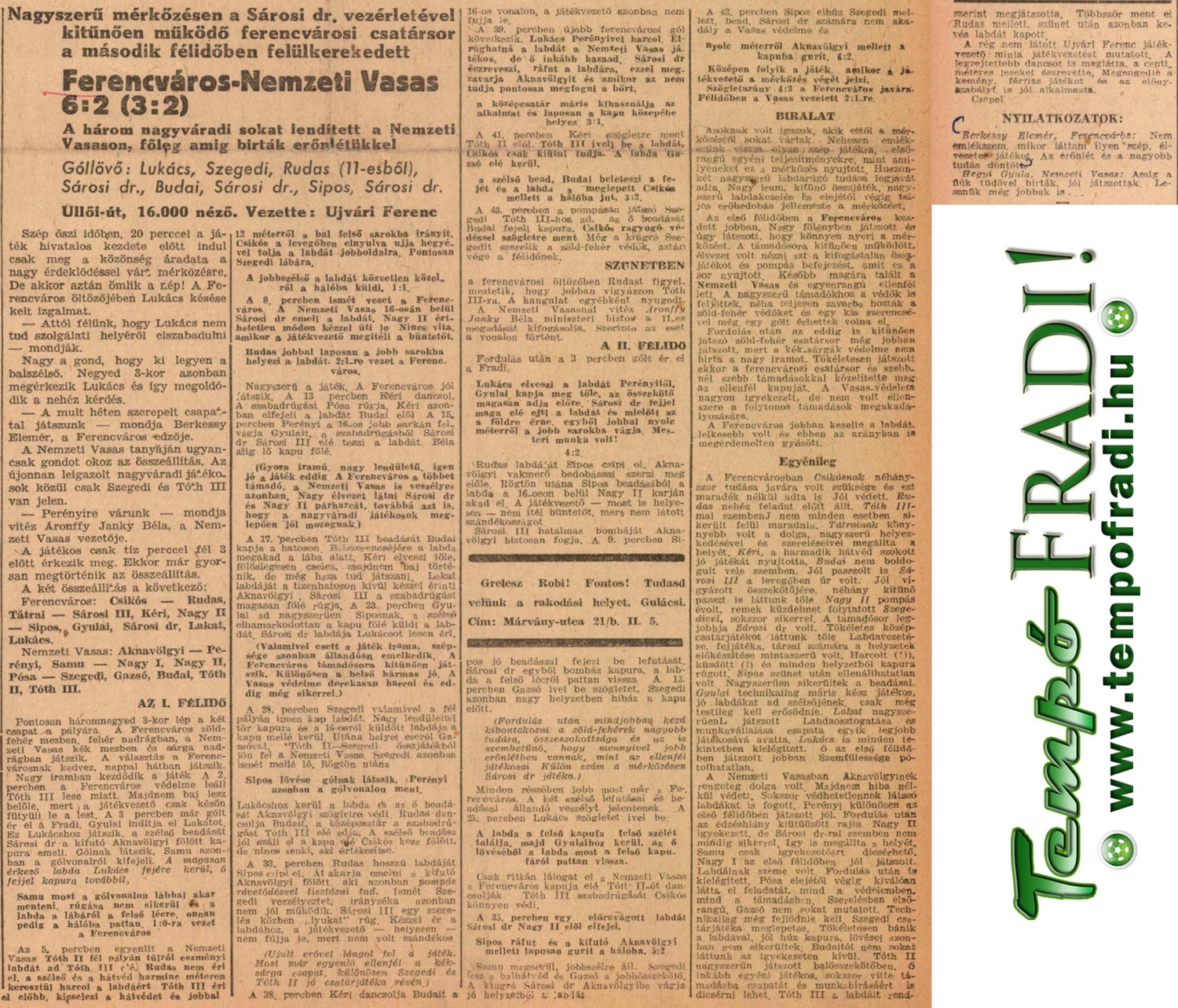 Istenem, micsoda emlékezés… micsoda történelem… egy héttel a Szálasi-puccs előtt…16000(!) néző akkor, amikor már minden férfit a frontra vezényelnek… már Szegeden oroszok vannak… és az a lelkesült riporter-hang (Ki lehetett? Vajjon Pluhár?)Mintha más probléma nem is lenne… az a vidám zene… fantasztikus korrajz… De a Fradi AKKOR IS Fradi volt! Ferenc Jóska, Horthy, Szálasi, Rákosi, Kádár stb. (a stb. az, ami azóta van), a FRADI az FRADI!!! Idősebbek vagyunk, mint vagy 150 ENSZ-tagállam! /Ja, és győzelmünk is több van…:)))/