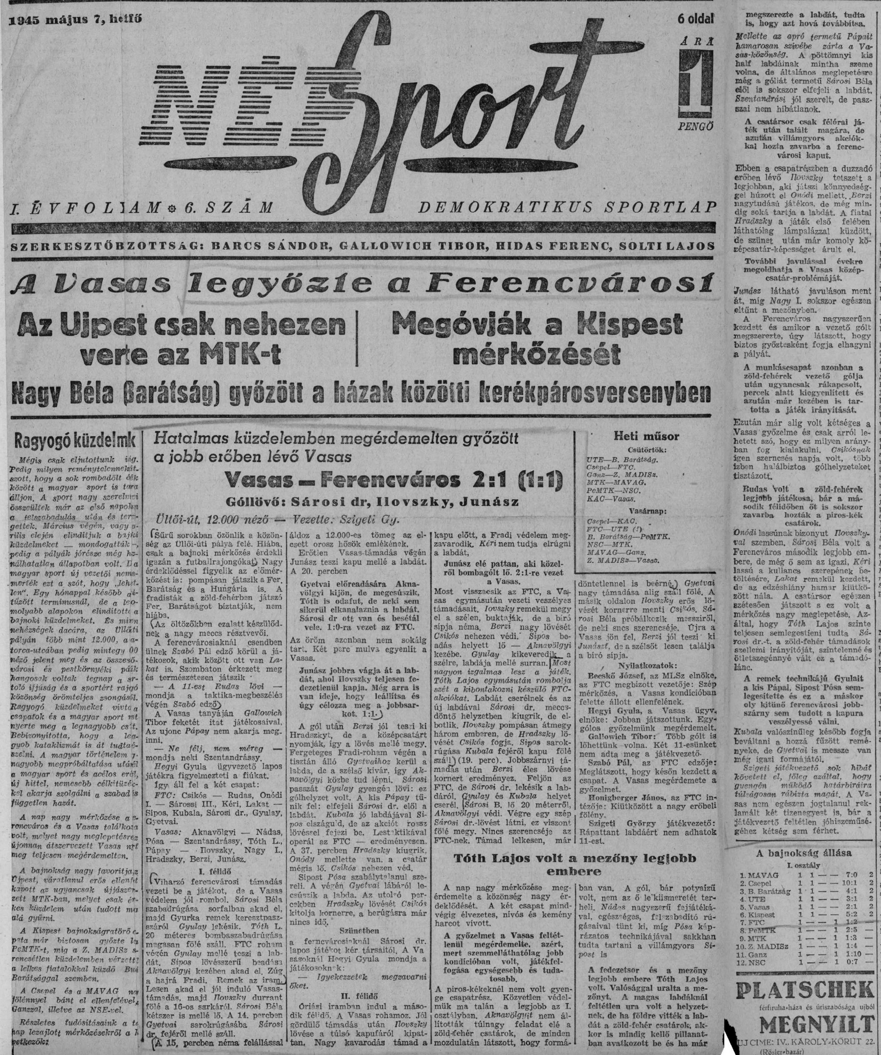 Kategória: 1945 | Címke: 1945 tavasz, Kubala László, NB1, Ónody I. Andor, Pósa Béla, Sárosi György dr., Szabó Pál, Tóth Lajos, Vasas