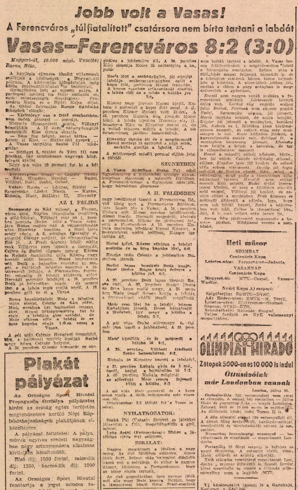 1948.VII.25. Centenáris kupa, Vasas – Ferencváros 8:2 Közzétéve: 2009. február 17. kedd | Szerző: K@rcsi Jobb volt a Vasas! A Ferencváros „túlfiatalított” csatársora nem bírta tartani a labdát Vélemény, hozzászólás? Válasz megszakításaAz e-mail címet nem tesszük közzé. A kötelező mezőket * karakterrel jelöltük Hozzászólás * Név * E-mail cím * Honlap Δ
