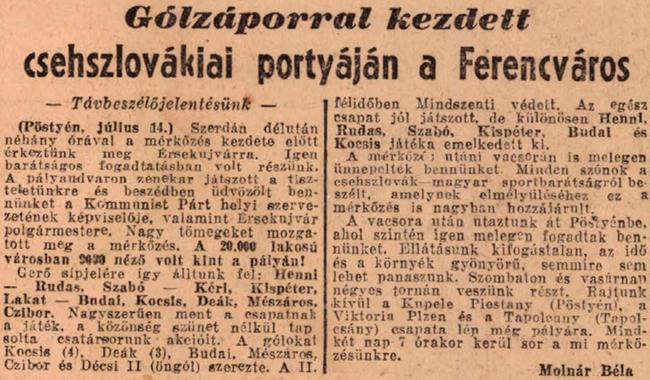 Elutazott a Ferencváros Csehszlovákiába • A zöld-fehérek színeit a következő játékosok képviselik a portyán: Henni, Mindszenti, Rudas, Szabó, Kéri, Kispéter, Lakat, Budai, Kocsis, Deák, Mészáros, Czibor, Schmidt, Dékány, Tihanyi, Horváth, Guba.