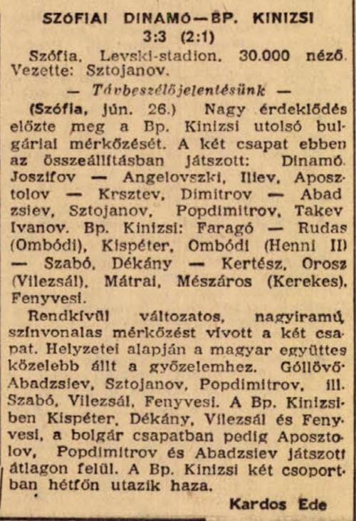 1954.VI.26. Dinamo Szófia – Bp. Kinizsi 3:3
