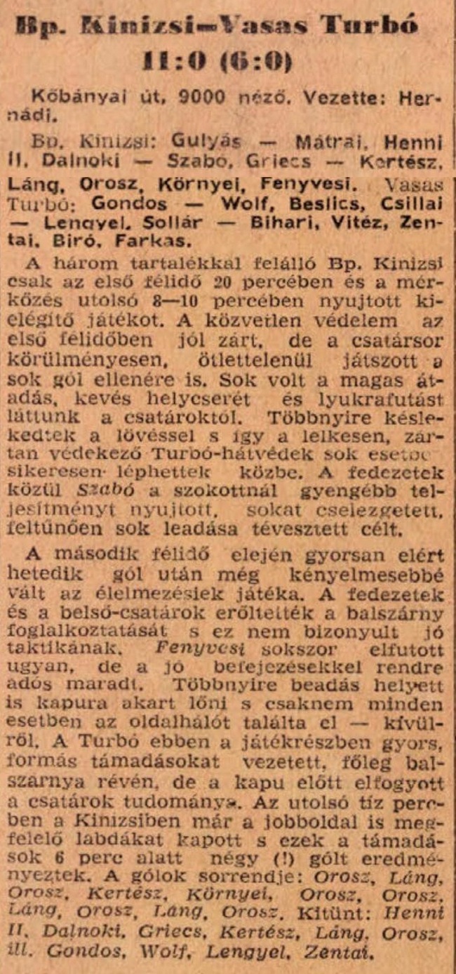 1955.II.13. MNK, Vasas Turbó – Bp. Kinizsi 0:11 Közzétéve: 2009. február 24. kedd | Szerző: K@rcsi Csillai igyekszik feltartani Fenyvesit NB I-es labdarúgó-csapataink zöme nagyarányú győzelemmel jutott tovább a labdarúgó Magyar Népköztársasági Kupában Vélemény, hozzászólás? Válasz megszakításaAz e-mail címet nem tesszük közzé. A kötelező mezőket * karakterrel jelöltük Hozzászólás * Név * E-mail cím * Honlap Δ