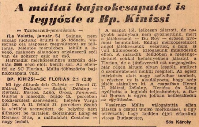 1956.I.4. Floriana – Bp. Kinizsi 1:2