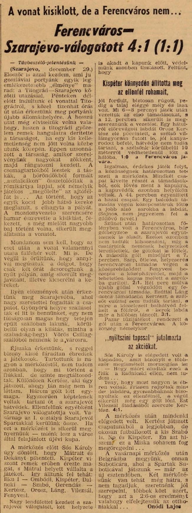 1956.XII.29. Sarajevo válogatott – Ferencváros 1:4