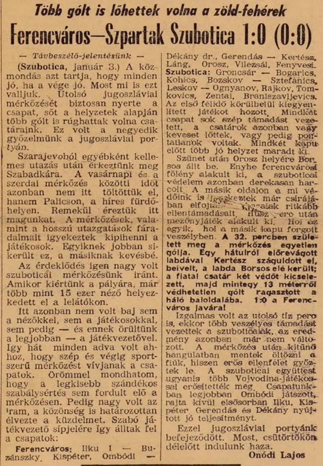 1957.I.2. Spartak Subotica – Ferencváros 0:1 Közzétéve: 2009. február 26. csütörtök | Szerző: K@rcsi Több gólt is lőhettek volna a zöld-fehérek Egy hozzászólás a(z) 11110100101ejegyzéshez Gunda Attila on 2022. február 6. vasárnap - 14:10 Ki volt ez az Onódi Lajos? Nem tudok róla semmit. Vélemény, hozzászólás? Válasz megszakításaAz e-mail címet nem tesszük közzé. A kötelező mezőket * karakterrel jelöltük Hozzászólás * Név * E-mail cím * Honlap Δ