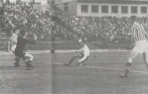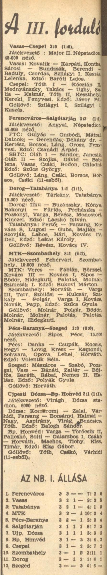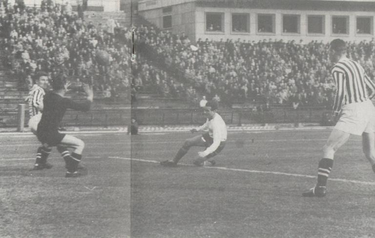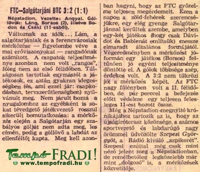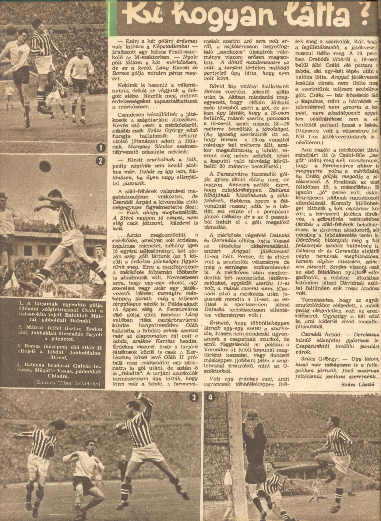 „A 16. percben Kertész elfutott, hosszan szöktetett, s a sajtóteraszról úgy látszott, hogy a labda el is hagyta egy hajszállal az alapvonalat. Tölgyesi partjelző azonban — aki az eset közelében állt — feltehetően jobban látta az esetet, mert nem intett, tovább engedte a játékot. Kertész beadását Láng kapásból a felső kapufára lőtte, majd a visszapattanó labdát hanyatvetődve 6 méterről a bal felső sarokba emelte, 1:0!”