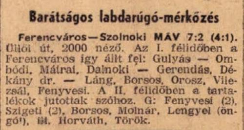 1957.IV.10. Ferencváros – Szolnoki MÁV 7:2 (edzőmérkőzés)