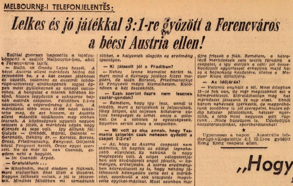 Izzadtan, de egy cseppet sem fáradtan vonul a csapat az öltözőbe. Kertész sérülése komoly. Nem játszhat a második félidőben. — Fiúk! Ezt is el kell viselni! Most még elszántabban kell játszani! És a fiúk nem ígérgetnek. Az elszántság azonban kiviláglik a szemekből: itt ma győznünk kell! A kissé megilletődött Friedmanszky helyett Borsos fut ki a második félidőben. A játék még jobb, mint az előbb. Vilezsál egyre másra küldi támadásba Fenyvesit. Borsos és Orosz ördöngös cselei összezavarják a lila-fehér védelmet. Láng nagyszerűen széthúzza a mezőnyt. No és hátul? Mátrai és Dalnoki a most feljavult Ombódival sziklaszilárdan állja Baumgartnerék próbálkozásait. A 75. percben végleg eldől a mérkőzés: Láng okos passzát Orosz elegánsan lövi az osztrák kapuba és ezzel 3:1! Az utolsó negyedórában a ragyogó erőben lévő zöld-fehér fiúk szinte összetörik az Austriát. Iskolajáték folyik a pályán! Odahaza talán már a fáklyákat is meggyújtanák. De itt csak az elismerés tapsa adja a játékhoz a kísérőzenét. És amikor Harrison játékvezető a mérkőzés végét jelzi, a ferencvárosi fiúk boldogan ölelkeznek össze. Legyőztük a nagy riválist!”