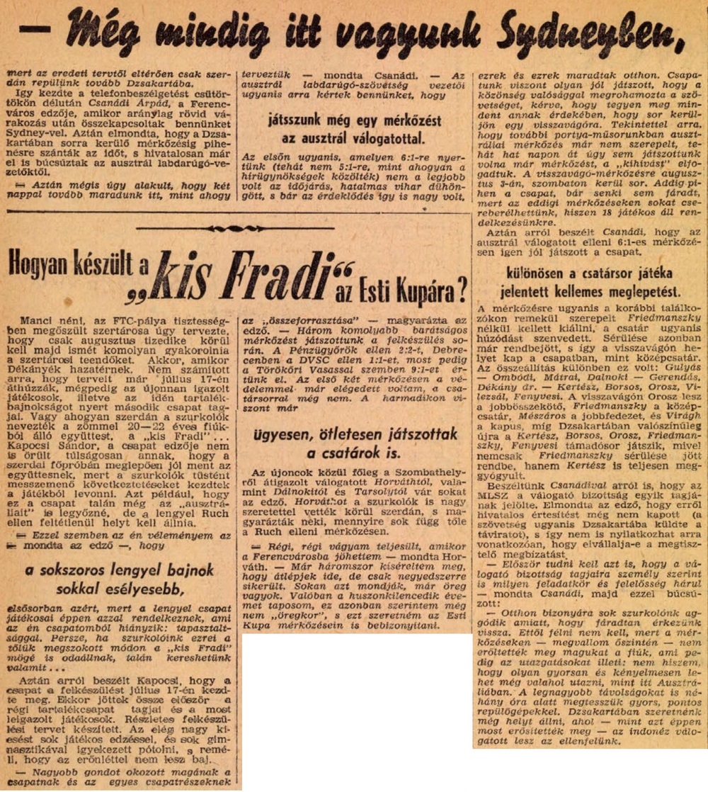 „A mérkőzés előtt egy órával még úgy volt, hogy elmarad a találkozó. Olyan kutyaidő volt, hogy őszintén szólva, mi sem bántuk volna. Végül mégis csak játszottunk. A fiúk mintha csak kárpótolni akarták volna a minden rosszat vállaló elszánt nézőket. Ragyogó játékkal rukkoltak ki. Az esőtől csúcszós füvön nagyszerűen adogattak. A robusztus ausztrálok alig álltak a lábukon. 3:1-es félidő után 6:1-re végződött a mérkőzés. Az egész csapat nagyszerűen játszott.