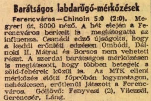 1957.X.16. Chinoin – Ferencváros 0:5 (edzőmérkőzés)