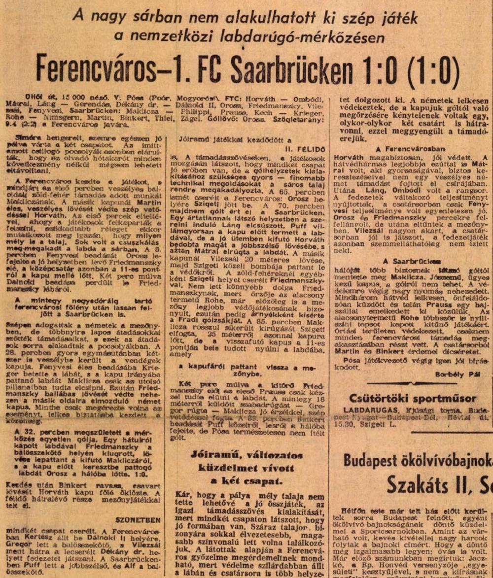 1958.III.26. Ferencváros – FC Saarbrücken 1:0 Közzétéve: 2009. február 27. péntek | Szerző: K@rcsi A nagy sárban nem alakulhatott ki szép játék a nemzetközi labdarúgó-mérkőzésen Vélemény, hozzászólás? Válasz megszakításaAz e-mail címet nem tesszük közzé. A kötelező mezőket * karakterrel jelöltük Hozzászólás * Név * E-mail cím * Honlap Δ