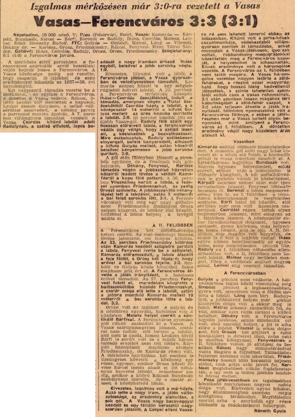 1958.VII.27. Vasas – Ferencváros 3:3