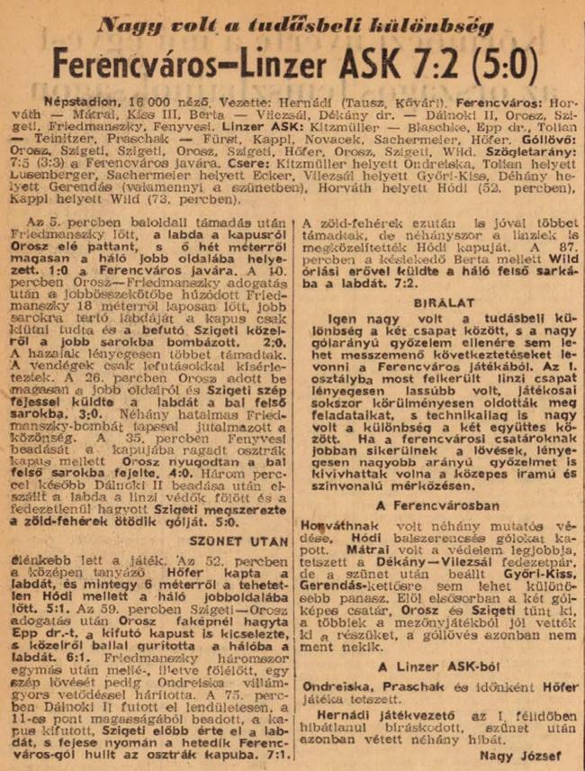 1958.VIII.16. Alkotmány kupa, Ferencváros – Linzer ASK 7:2