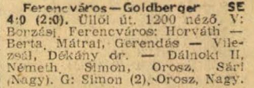 1960.III.2. Ferencváros – Goldberger SE 4:0 (edzőmérkőzés)