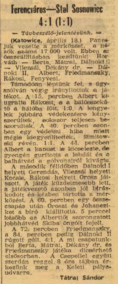 1960.IV.18. Húsvéti torna, Stal Sosnowiec – Ferencváros 1:4