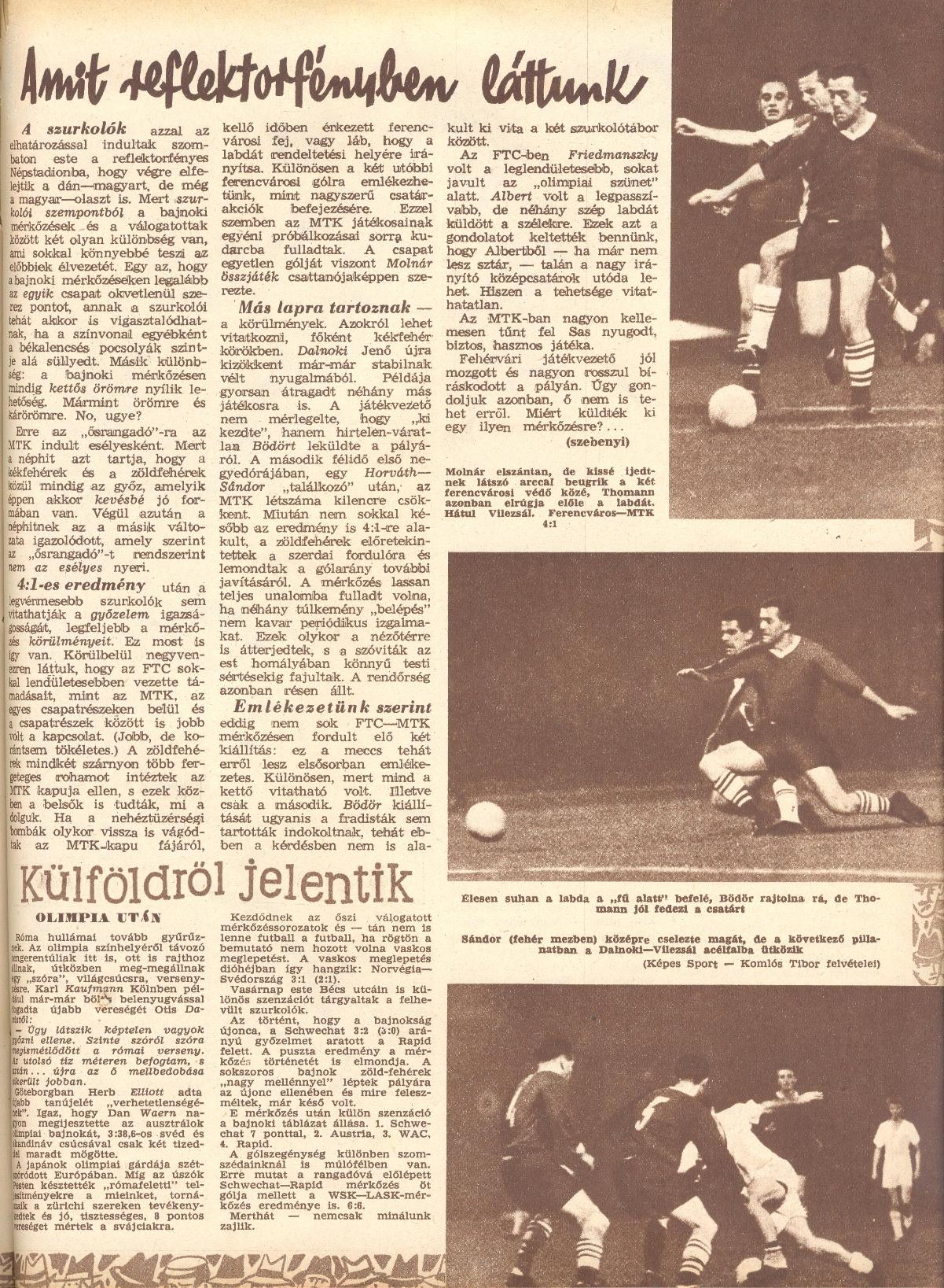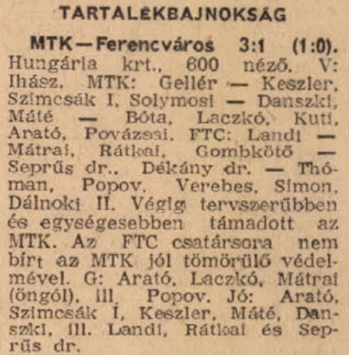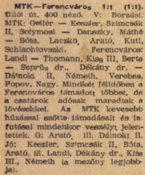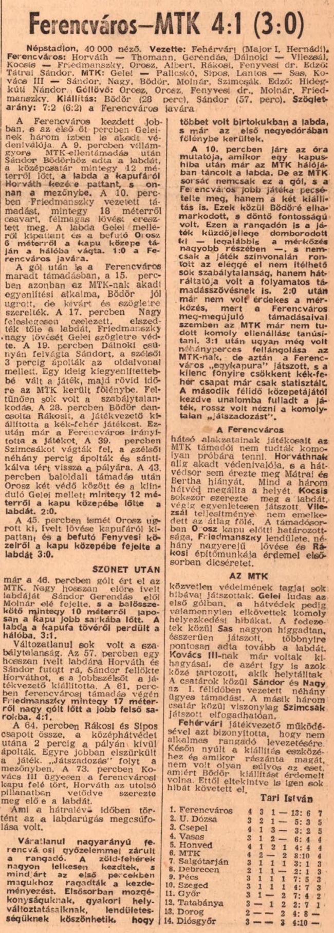 A Ferencváros félidőben már 3:0-ra vezetett! Az MTK-ból egyébként Bödör (a 28. percben) és Sándor (az 57. percben) a kiállítás sorsára jutott … Dalnokit és Gerendást nem állította ki Fehérvári játékvezető (ezért a bírót el is tiltották!) — de az MLSZ fegyelmi bizottsága ellenük is vizsgálatot rendelt el. Végül őket is eltiltották 1—1 mérkőzéstől.