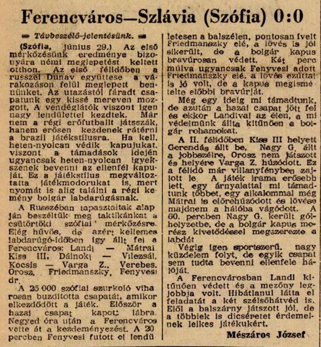 1961.VI.29. Slavia Szófia – Ferencváros 0:0