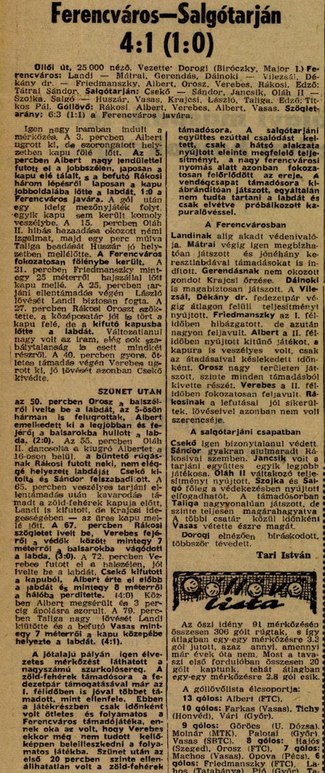 Kategória: 1960/61 | Címke: 1960/61, Albert Flórián, büntető (kihagyott), NB1, Rákosi Gyula, Salgótarjáni BTC, Verebes József