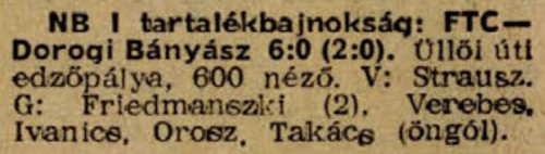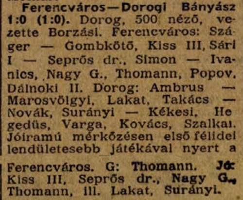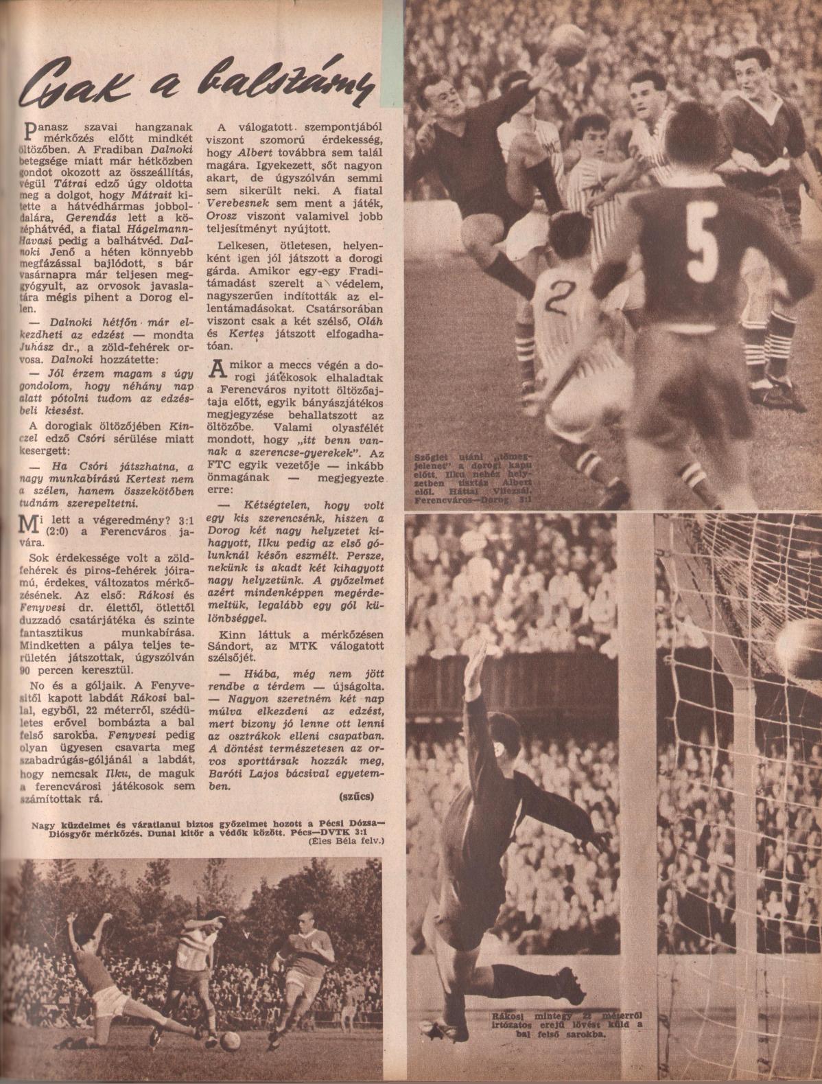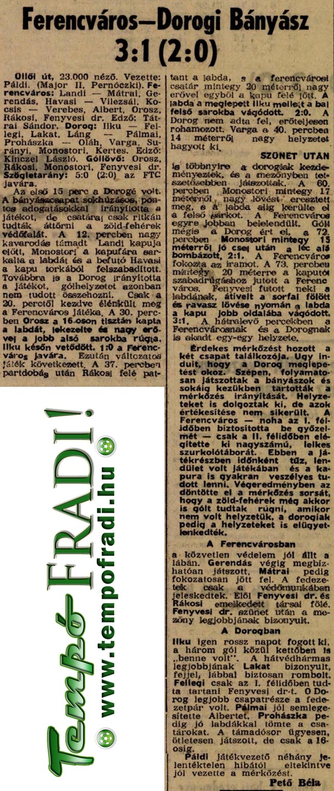 « 1961.V.31. Ferencváros – Erdészet 11:3 (edzőmérkőzés) 1961.VI.11. Ferencváros – Tatabányai Bányász 2:3 (edzőmérkőzés) »