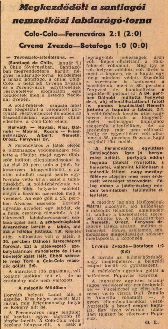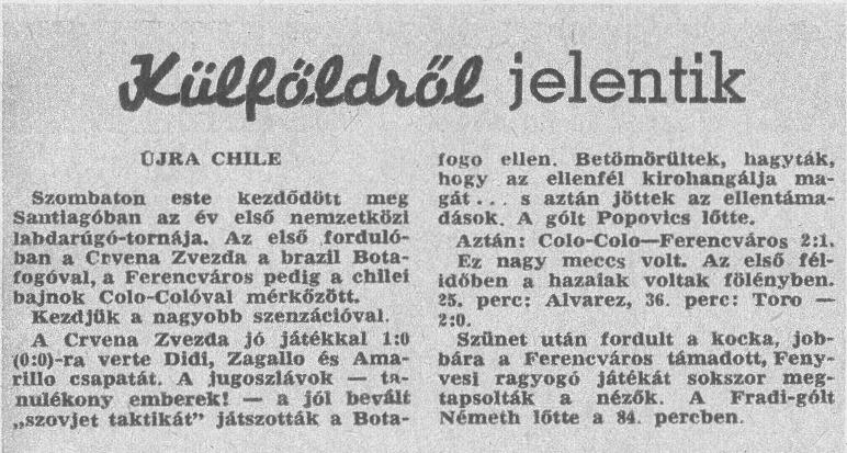 1962.I.7. NT, Colo-Colo – Ferencváros 2:1 Közzétéve: 2009. március 3. kedd | Szerző: K@rcsi Valahol Dél-Amerikában (fotó: Kocsis György gyűjteményéből) Megkezdődött a santiagói nemzetközi labdarúgó-torna Colo-Colo—Ferencváros 2:1 (2:0) Crvena Zvezda—Botafogo 1:0 (0:0) Vélemény, hozzászólás? Válasz megszakításaAz e-mail címet nem tesszük közzé. A kötelező mezőket * karakterrel jelöltük Hozzászólás * Név * E-mail cím * Honlap Δ