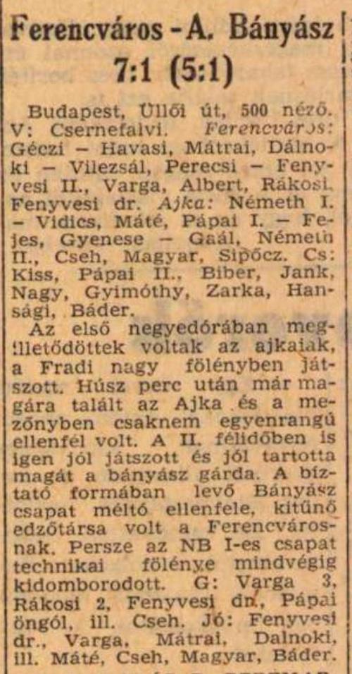 1964.III.11. Ferencváros – Ajkai Bányász 7:1 (edzőmérkőzés)