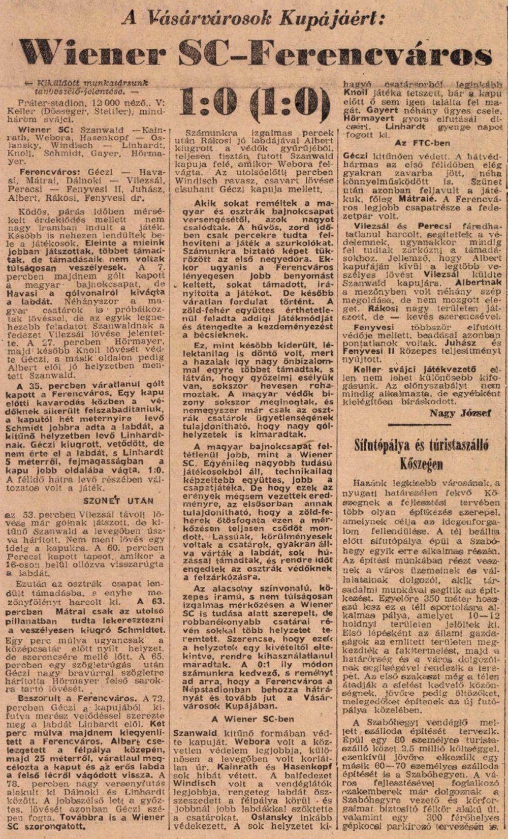 Lassúak és körülményesek voltunk, a csatárok állva várták a labdát mellyel időt adtak az osztrák védőknek a beavatkozásra. Nálunk volt többet a labda, mégis a Wiener SC szerzett gólt, az első félidő 35. percében. A vereség ellenére nem tört ki „pánik”, hiszen a Fradi sokkal jobb erőt képviselt és a csapat valamint a szurkolók is bíztak abban, hogy a visszavágón, már Novákkal és Vargával erősödve, simán kiharcoljuk a továbbjutást.