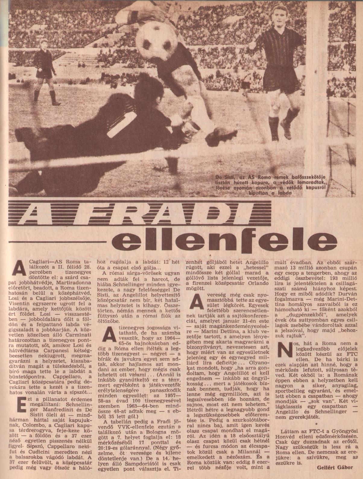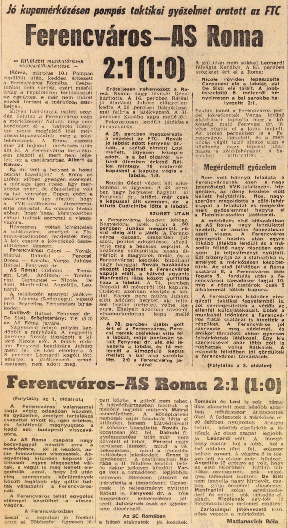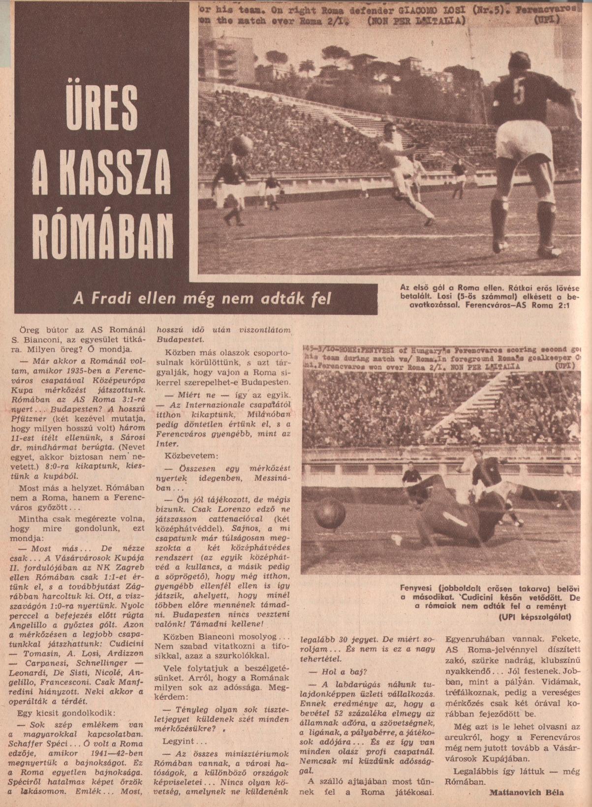 „Omnes viae Romam ducunt” – Minden út Rómába vezet, tartja a régi mondás. Az ókori rómaiak már tudták (könnyű volt nekik, eltanulták a perzsáktól), hogy egy város csak akkor lehet kereskedelmi és társadalmi központtá tenni, ha mindig út vezet oda. Mint Olaszország és Róma nagy szerelmesének, nekem a kedvenc szállóigén a „Umbilicus Urbis Romae”, vagyis Róma a világ köldöke, mely jelző a legélethűbben fejezi ki a város jelentőségét a történelem, a művészet és a kultúra világában. A harmadik ismertebb mondás szerint „Romát látni és meghalni”, bár ennek eredete már elég kétséges. Vannak akik a babazsúrnak éppen nem nevezhető római birodalomig eredeztetik (annak idején volt is alapja), de sokak szerint inkább Nápolytól „csenték” el a mondást, mely ráadásul nem is olasz eredetű, hiszen azt Goethe írta le az Utazás Itáliában című művében. A mondásokat ismerjük, azt már csak hallomásból, régi anekdotákból, hogy vajon mit is érezhettek a Ferencváros játékosai, amikor repülőgépük egy kis kerülő után, 1965. március 9-én landolt Rómában. Vajon a megérkezés pillanatában felmerült-e bennük, hogy a Trevi-kút, a Szent Péter-bazilika, a Viktor Emanuel-emlékmű, a Forum Romanum, a Colosseum és a Pantheon várná őket, ha aznap este nem kéne megmérkőzniük az AS Roma csapatával, a VVK sorozat harmadik fordulójában.