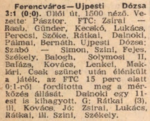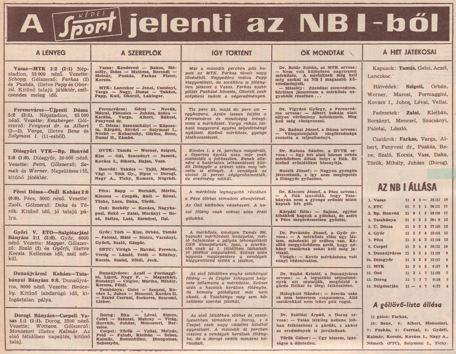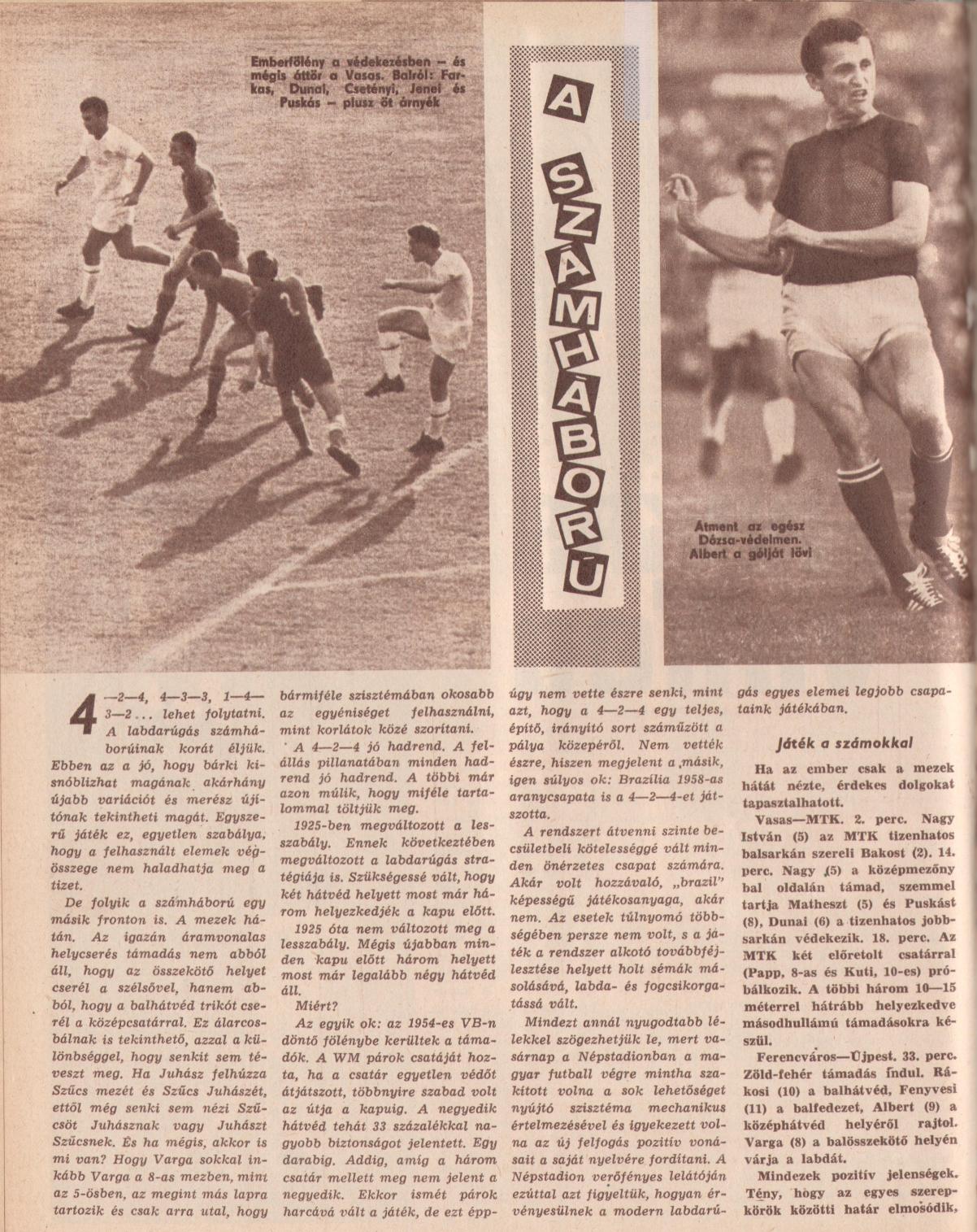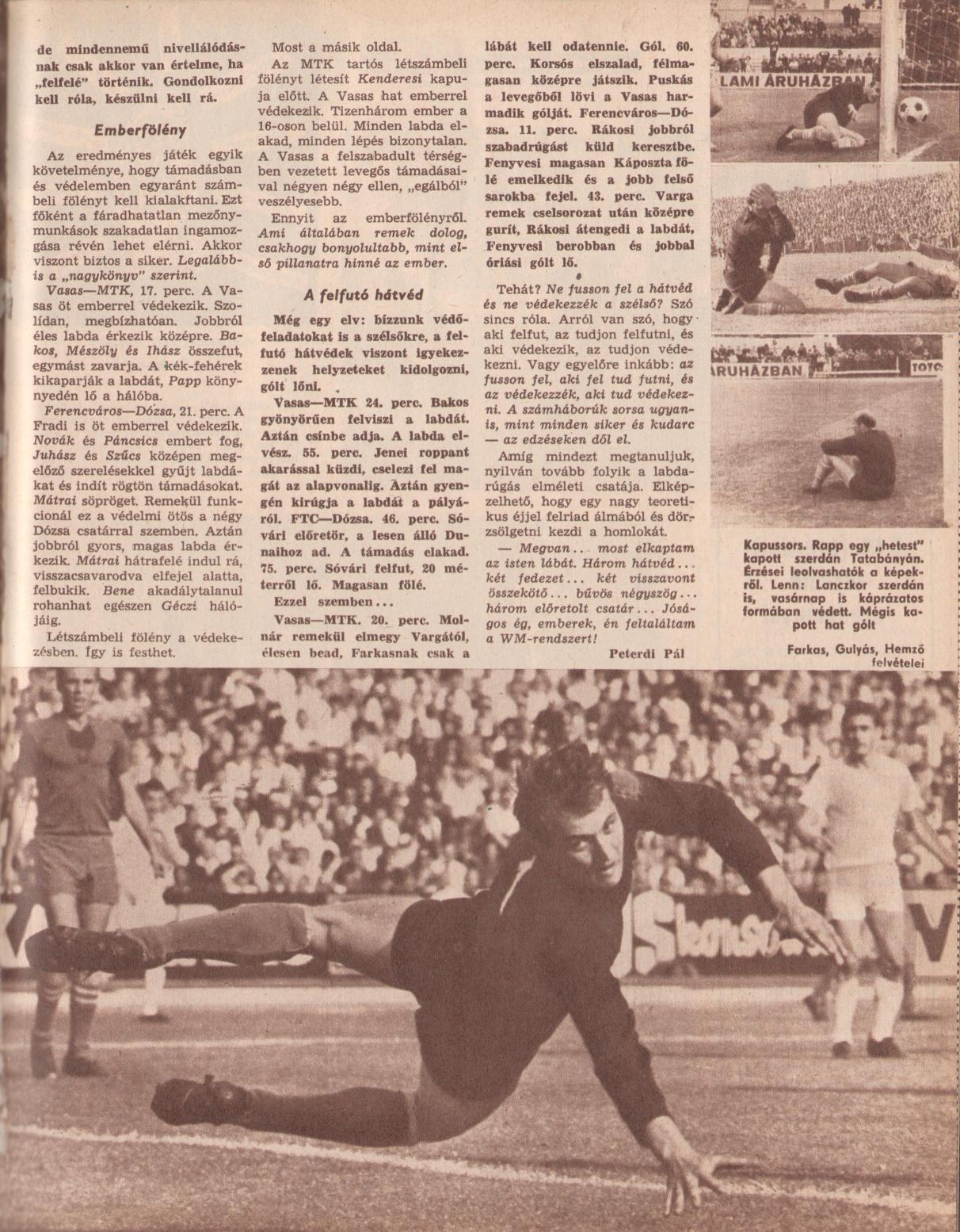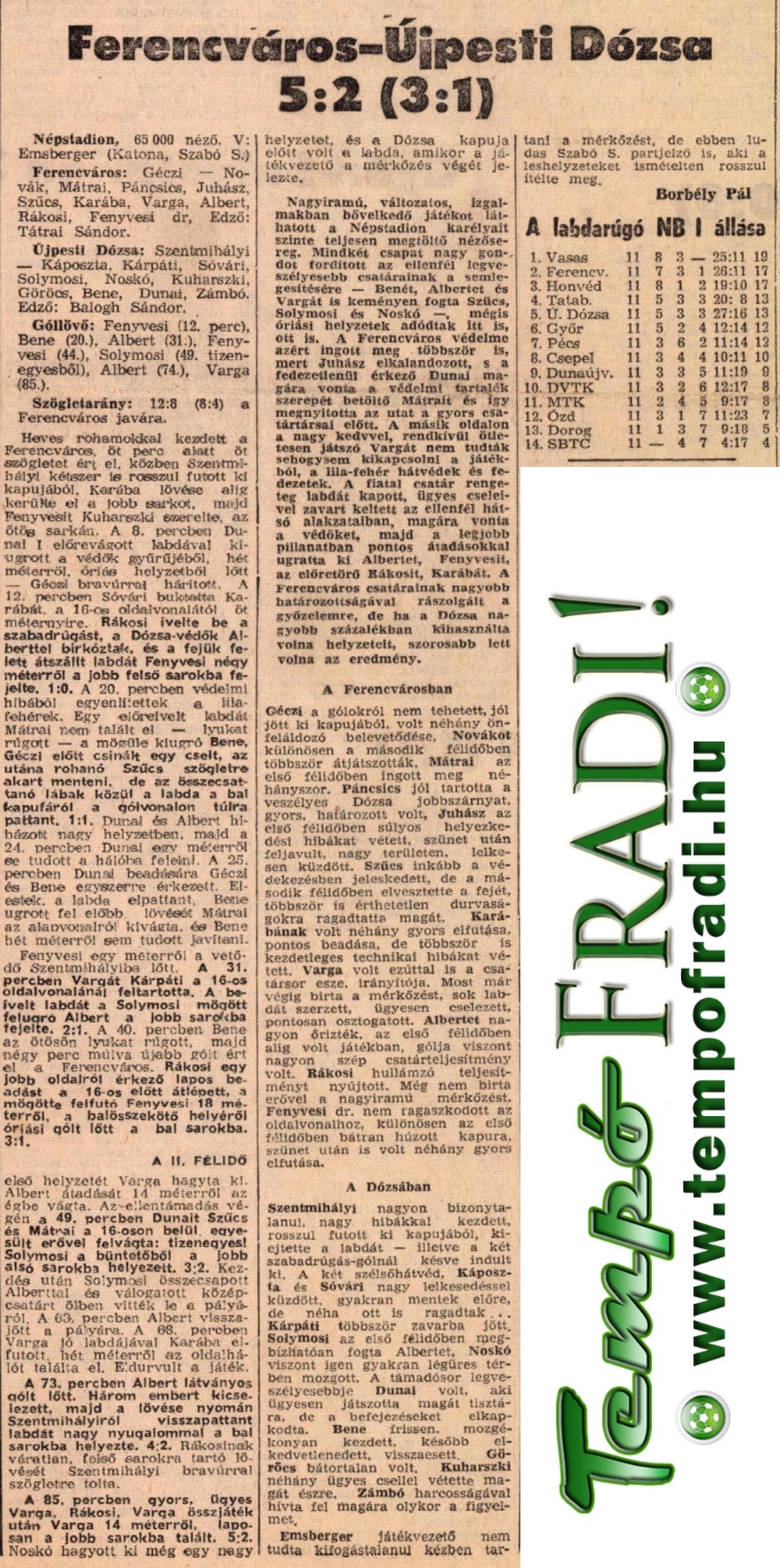 Jött a Fradi-Dózsa. (Itt nem kellett nekem magyarázni, hogy kinek szurkolunk…) Az első félidő izgalmas volt, lehet, hogy még az Újpest is vezetett, de már 3:2-vel fordultunk. A második félidő maga a csoda volt, bár őszintén, nem sokat láthattam belőle. Az Újpest támadott, a Fradi labdát szerzett, sorra indultak az Albert – Varga ellentámadások, és az egész stadion állandóan fölpattant. Emlékeim szerint vagy huszonötször. Én ilyenkor persze alig láttam valamit… Azt máig sem értem, miért csak két gól született ezekből a nagy játékokból. De körülöttem áradozott mindenki, hogy ez az igazi futball.