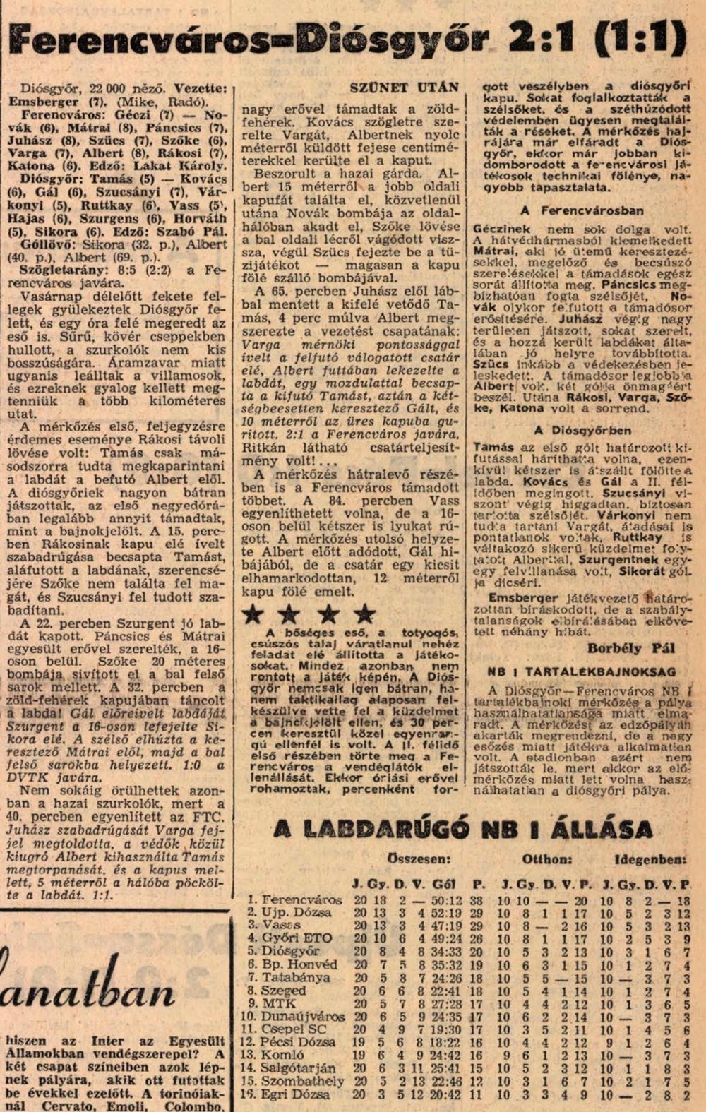 A Fradi győztes gólja a 69. percben esett, amikor Albert a rá jellemző módon úgy tört a kapura, hogy közben az előtte „őrt” álló hazai védők dőltek mint a tekebábuk. A „végső megoldás” előtt a kifutó Tamás mellett is elhúzta a labdát majd az üres kapuba gurította a Fradi győztes gólját. Győztünk 2:1-re, mellyel a 20. forduló után a veretlenül vezettük a bajnoki tabellát. Az esős, csúszós pályán nem volt könnyű kiharcolni a győzelmet, de Albert és Mátrai remek játéka hozzásegítette a csapatot az újabb sikerhez.