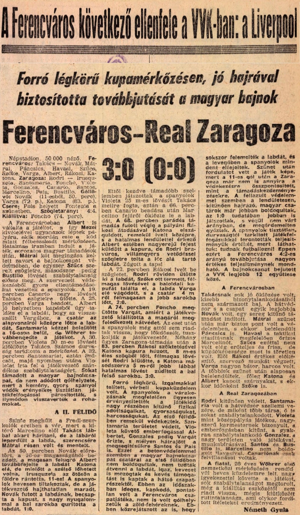 1967.XI.16. VVK, Ferencváros – Real Zaragoza 3:0