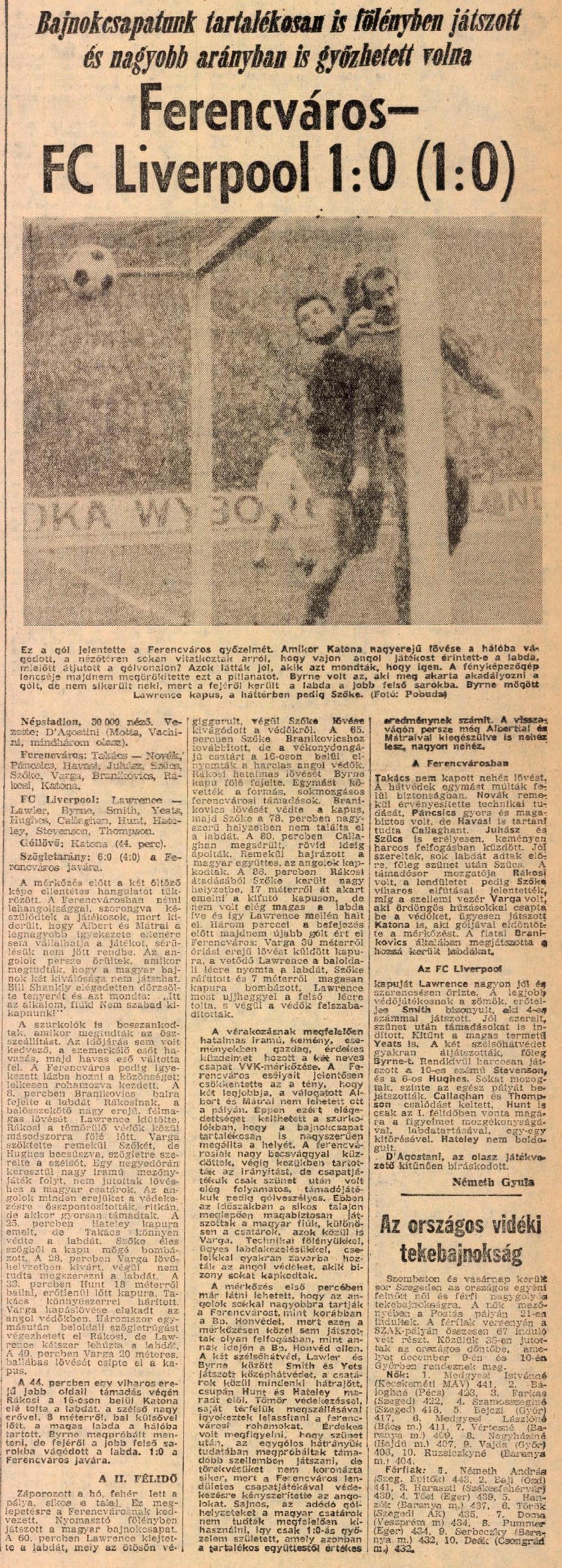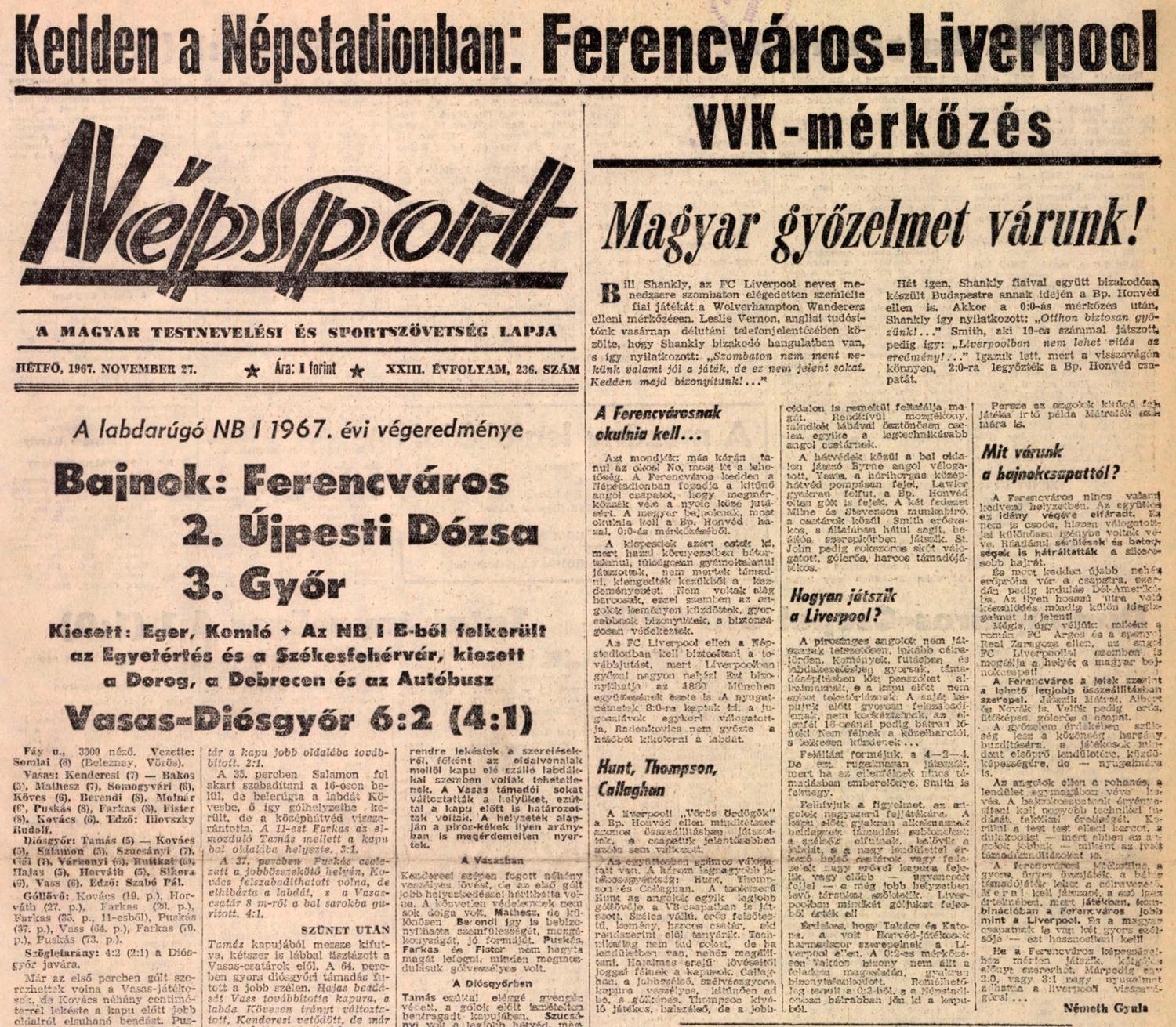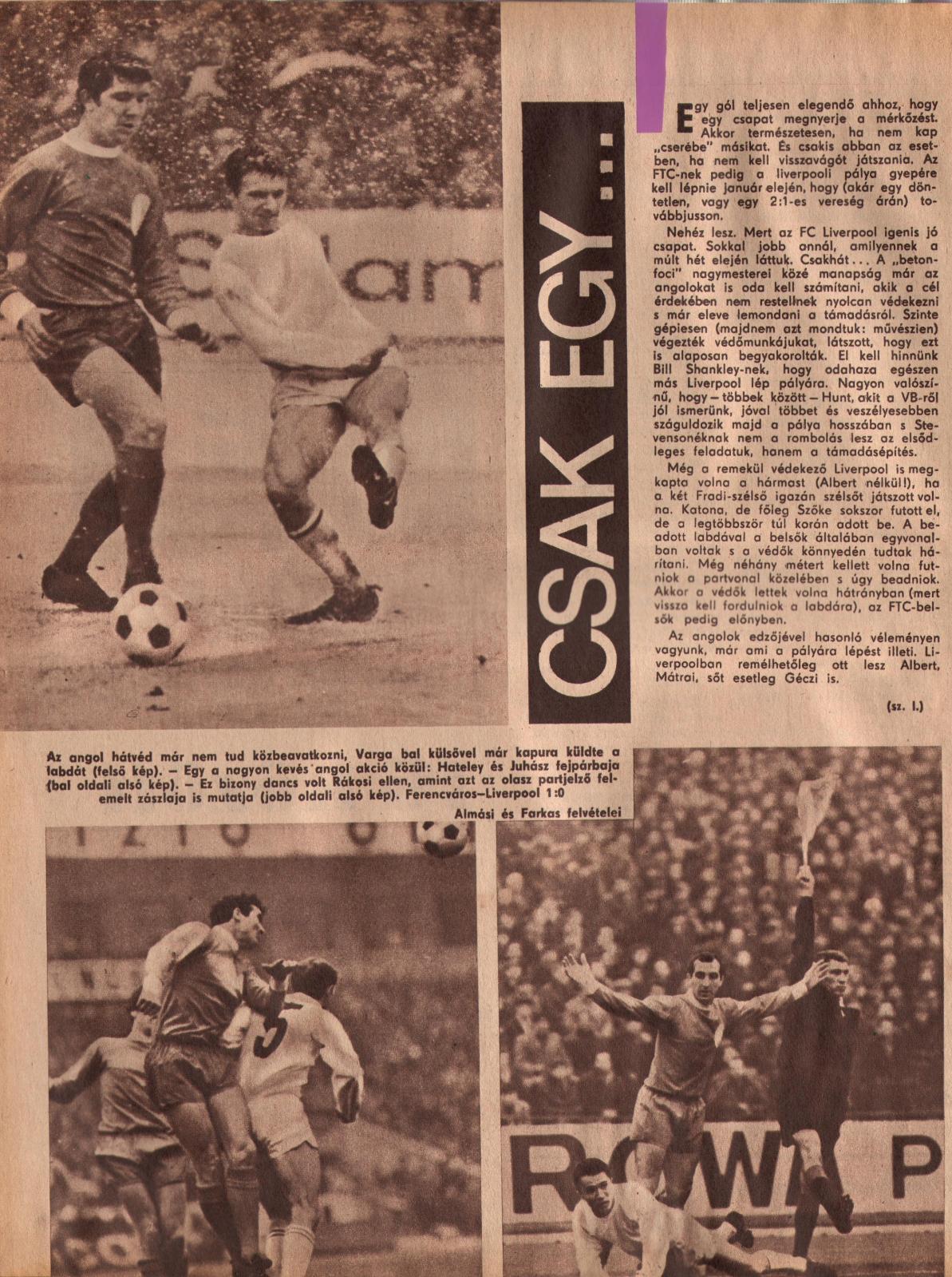1967.11.28., Népstadion: Ferencváros – Liverpool: 1-0, VVK 3. forduló 1. mérkőzés