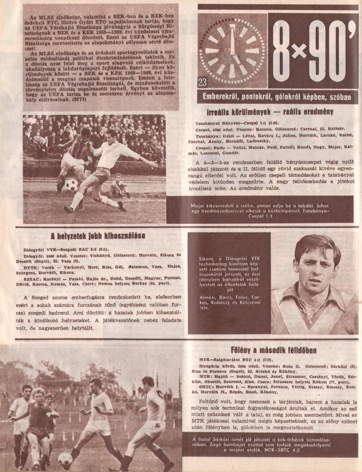 Eddig két olyan apró mozaikdarabkát találtunk melyek említése kiemeli az 1968-s mérkőzést a statisztika adatok szürkeségéből. Ezzel még nincs vége, mert van még egy érdekes utalás, mely konkrétan nem tartozik a találkozóhoz, de azon a napon jelent meg a Képes Sport hasábjain, amikor a 23. forduló mérkőzéseiről számoltak be. Az előbbiekben már eljátszottunk a „ha 1968” szófordulattal, de akkor még csak a sportot rendeltük hozzá, de ebben az évben olyan eseményeket is történtek mely magát a sportot és a labdarúgást, sőt a Ferencvárost is befolyásolták. Egy hónappal a Videoton elleni mérkőzés előtt, a Varsói Szerződés országai (köztük Magyarország is) szovjet vezetéssel, 200 000 katonával, 5000 harckocsival lerohanták Csehszlovákiát, hogy véget vessenek a prágai tavasz néven emlegetett demokratikus folyamatoknak. Az agressziónak sport vonulata is volt, hiszen a háborús viszonyok miatt a nyugati csapatok nem akartak Csehszlovákiában pályára lépni, ezért az UEFA újrasorsolta a BEK és a KEK küzdelmeit, amit meg a kommunista országok vettek rossz néven. Az akkori MLSZ „politikai diszkriminációnak” minősítette a döntést, és nem engedte a Fradinak a BEK-, a Győrnek meg a KEK indulást. Ezzel sokak szerint el is vették a magyar labdarúgás egyik legnagyobb sikerének az esélyét, a Fradi esetleges BEK győzelmét, amiben oly sokan hittek 1968-ban.