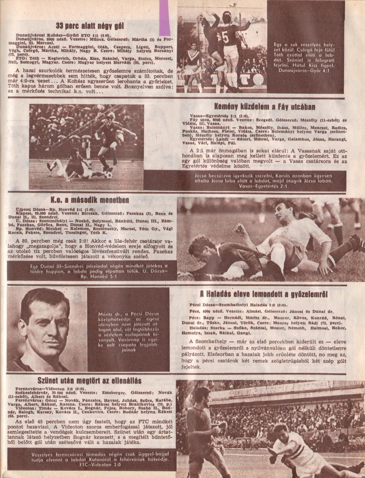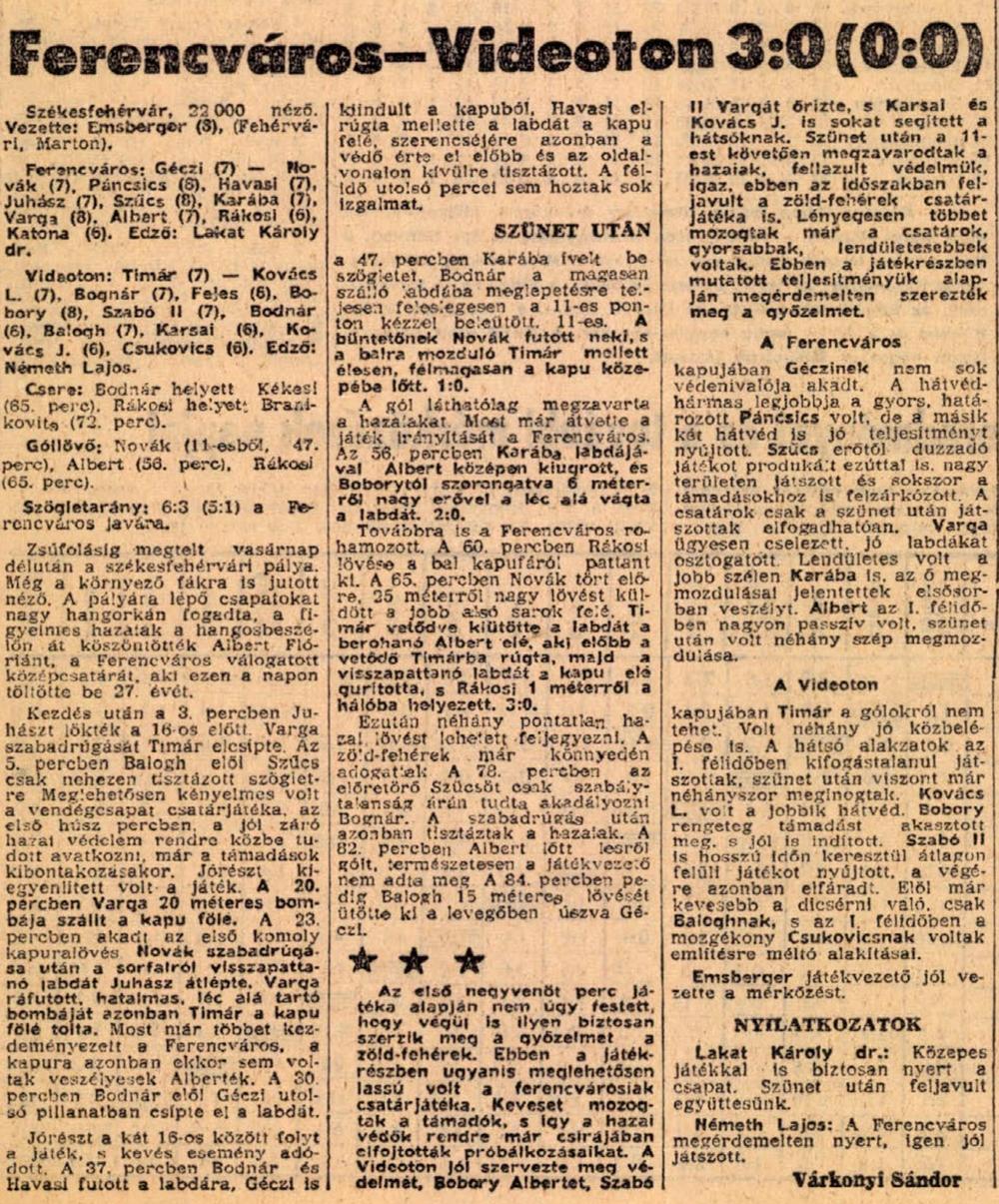 Ennyi apró „morzsa” után talán érdemes lenne magával a mérkőzéssel is foglalkozni, mely az első Videoton – Ferencváros bajnoki összecsapás volt és ahol Varga Zoltán utoljára lépett pályára zöld-fehérben. Ráadásul a mezőny egyik legjobbja is volt Páncsics és Szűcs társaságában (mindhárman 8-s osztályzatot kaptak). Maga a találkozó nem hozott meglepetést, az esélyes Fradi simán nyert Novák, Albert és Rákosi góljával. De ha már az előbb apró morzsákat említettem, akkor még ide tartozik az is, hogy Albert Flórián, a magyar labdarúgás egyetlen aranylabdása (1967) a mérkőzés napján ünnepelte huszonhetedik születésnapját! A csapat győzelemmel, a Császár góllal ünnepelte az évfordulót. Győzni persze „kötelező” is volt, hiszen a bajnokságban nagyon kiélezett küzdelmet vívott egymással a Fradi és az Újpesti Dózsa. A székesfehérvári győzelmünk után is csak jobb gólkülönbségünkkel vezettünk az ősi rivális előtt. A bajnokság végén azért mi örülhettünk, egy ponttal előztük meg a lila-fehéreket.