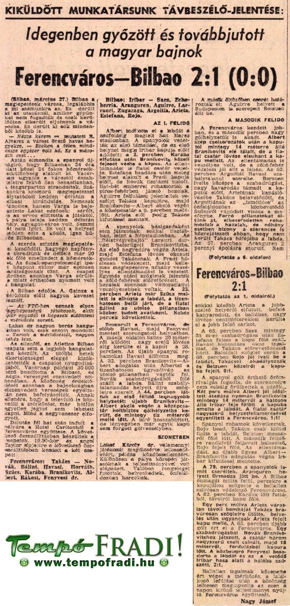 Annak ellenére, hogy csak kerülő úton jutott el a Fradi Bilbaóba (a repülőgépet nem fogadták egyből a reptéren) és a mérkőzés előtt Páncsics mellett Varga is sérültet jelentet, a baszkok edzője nagyon udvariasan nyilatkozta, hogy a Fradinak olyan játékosai vannak, akik egyedül is képesek eldönteni egy mérkőzést. Bár ebben igaza volt az edzőnek, de a visszavágó mérkőzésen, mint csapat működött tökéletesen a Fradi. Páncsicsot az a Bálint Laci helyettesítette, aki húsz évesen, mindössze néhány Fradi mérkőzéssel a háta mögött (1968. március 3.-án mutatkozott be a felnőtt csapatban), került a védelem tengelyébe, ahol Havasival szinte hibátlanul játszották végig a mérkőzést! Sokak szerint a „Báró”, ezzel a mérkőzéssel tette le a névjegyét, mely után az 1979-es profi szerződéséig a Ferencváros meghatározó játékosává vált.