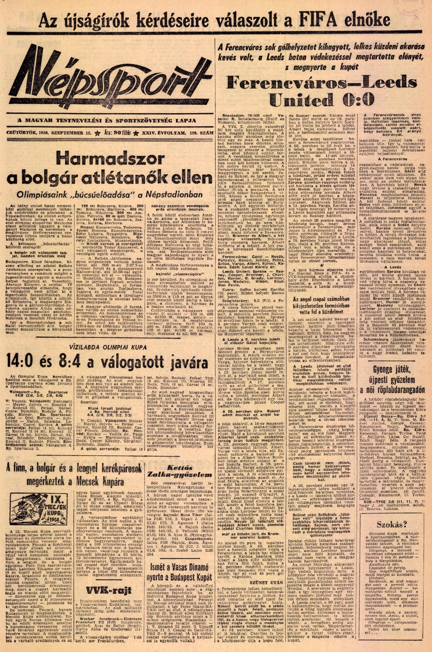 1968.IX.11. VVK Döntő, Ferencváros – Leeds United 0:0