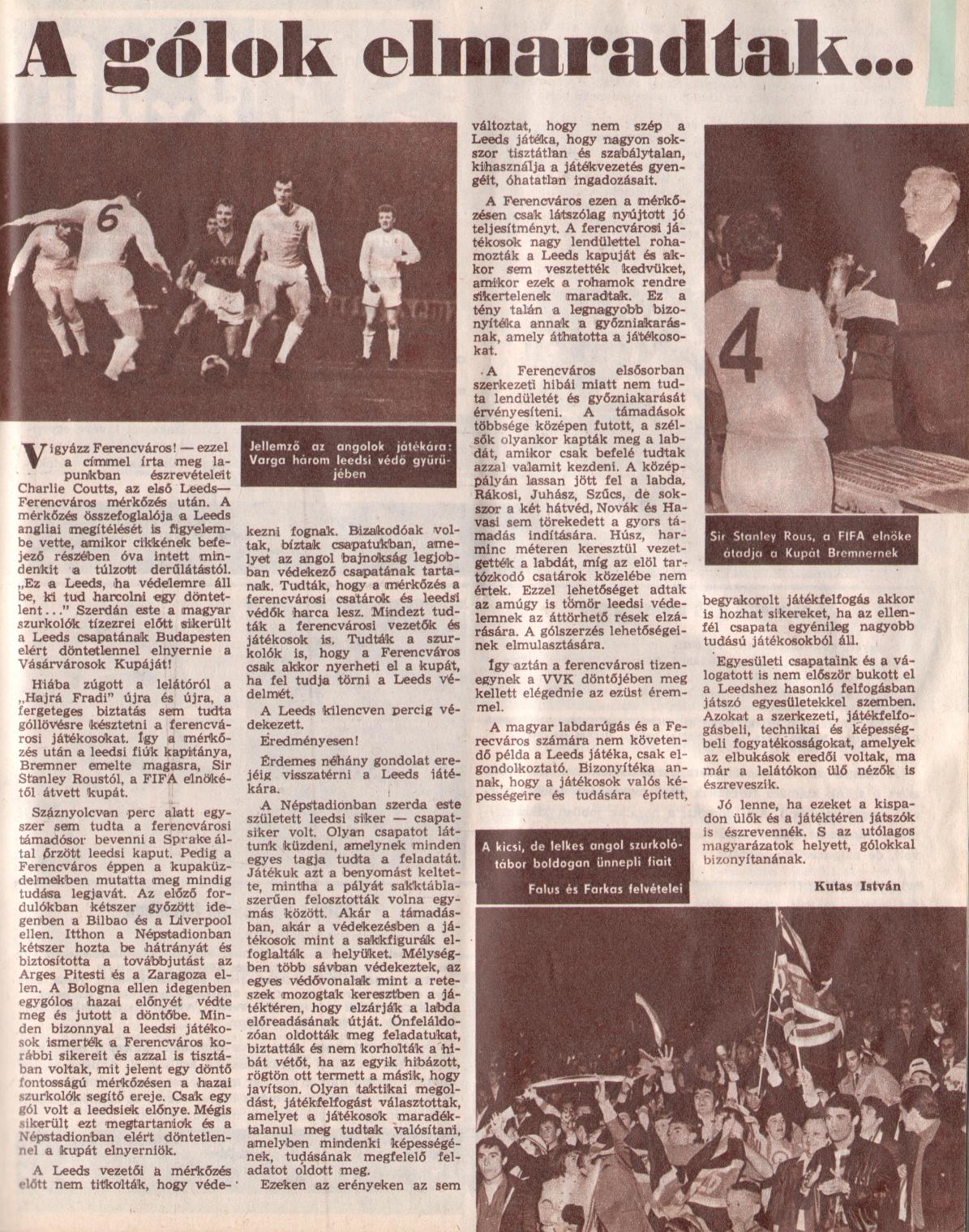 Micsoda csalódás, „kudarc” volt akkoriban … ifjaknak mondom: az a Leeds United, mely kb. 67-75 között uralta a fél világot, MINDEN IDŐK egyik legnagyobb angol (brit) klubcsapata volt! Oh, Billy Bremner, Jackie „Zsiráf” Charlton, Lorimer, Cooper, Hunter … micsoda nevek, micsoda óriási játékosok … sokszoros angol vagy skót válogatottak … J. Charlton pl. világbajnok volt … csak úgy … nos, ez a csapat végigbekkelte a visszavágót és nagyon boldog volt, hogy kihúzta a Ferencváros ellen … az első meccsen egy szabálytalan gól … ezzel nyerték a kupát … az egész világ és Sir Stanley Rous megdöbbenésére … tehát, ifjak, kéretik AZT a Fradit így elhelyezni: a brit futballtörténelem egyik legjobb csapata óriási szerencsével és meglepetésre megszerezte a kupát a Fradi elől … ami akkor blamának számított … mintha ma az Euroliga döntőt óriási balszerencsével elveszítenénk a Chelsea vagy Man. City ellen … még ez sem pontos, mert akkoriban CSAK a bajnok indult a BEK-ben, a 2.-3.-4.-5 pedig a VKK/EVK/UEFA Kupában … sokszor erősebb volt a mezőny, mint a BEK-ben … de legalábbis sűrűbb … Ergo: kedfves Fradista társaim, nekünk a „9/11” legyen ünnepnap! Európai Kupadöntőt játszottunk a zsófolt Népstadionban!