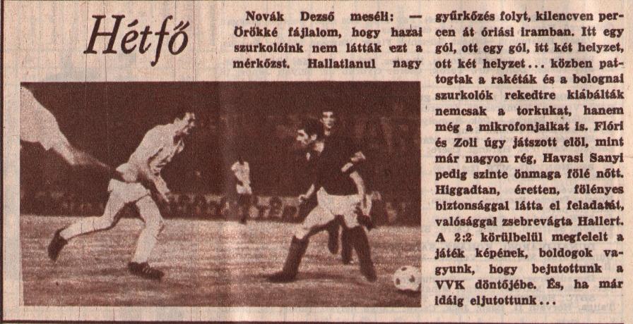Magára a döntőre még várnunk kell néhány hónapot (1968.08.07. és 1968.09.11.), ezért néhány mondat erejéig még térjünk vissza a Bologna elleni visszavágó mérkőzésre. Varga Zoli parádés szabadrúgása nyitotta meg a gólok sorát, mely után az olaszok fordítottak és a mérkőzés 70. percében Havasi góljával sikerült egyenlíteni, mely a továbbjutásunkat is jelentette. A mérkőzés után, a klub akkori elnöke, Kalmár István könnyes szemekkel nyilatkozta, hogy a csapattól a legszebb születésnapi ajándékot kapta a kivívott továbbjutással.
