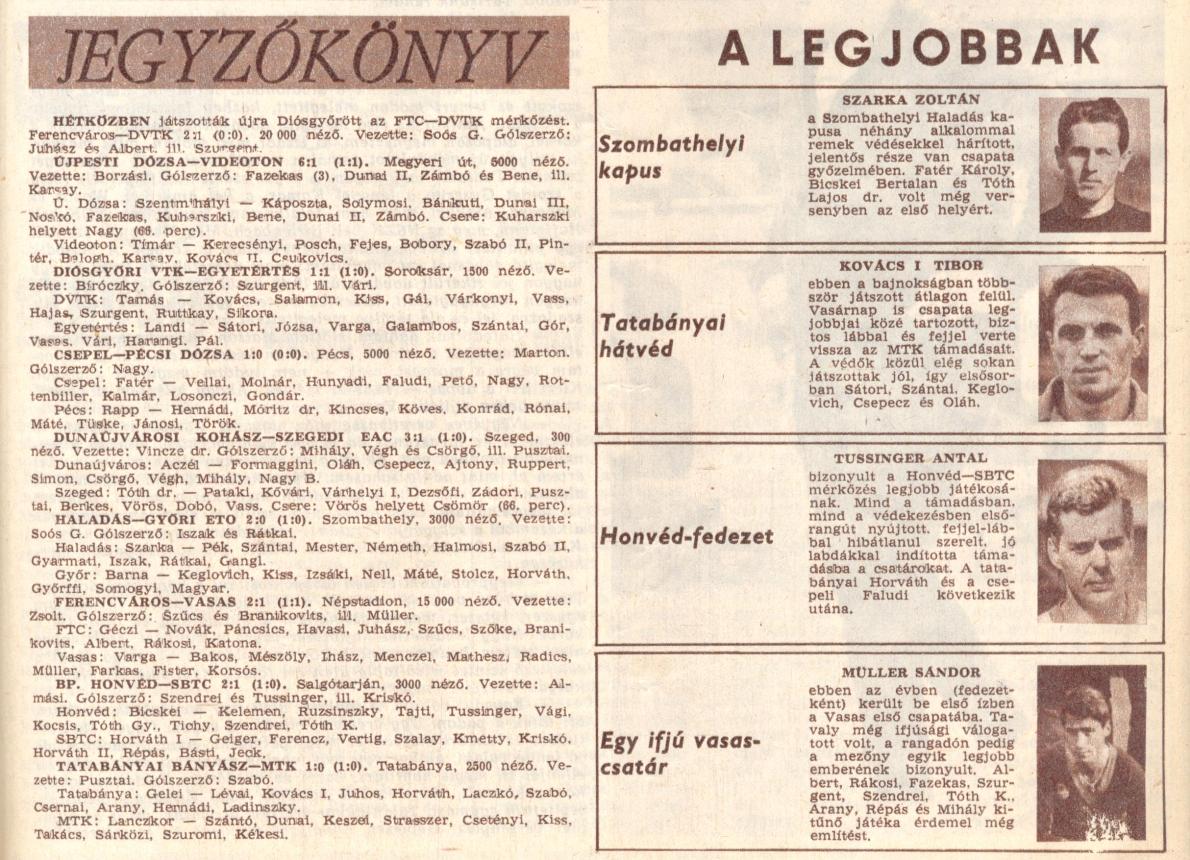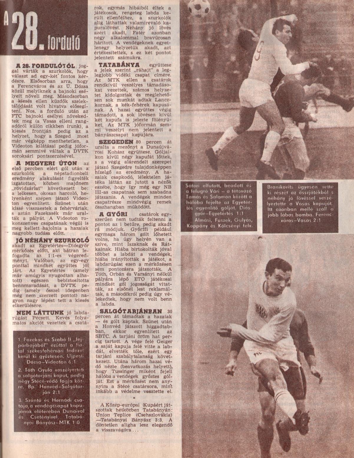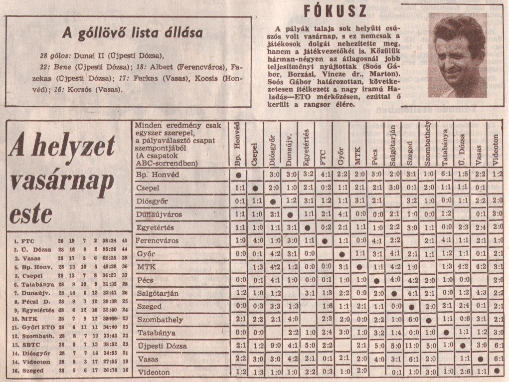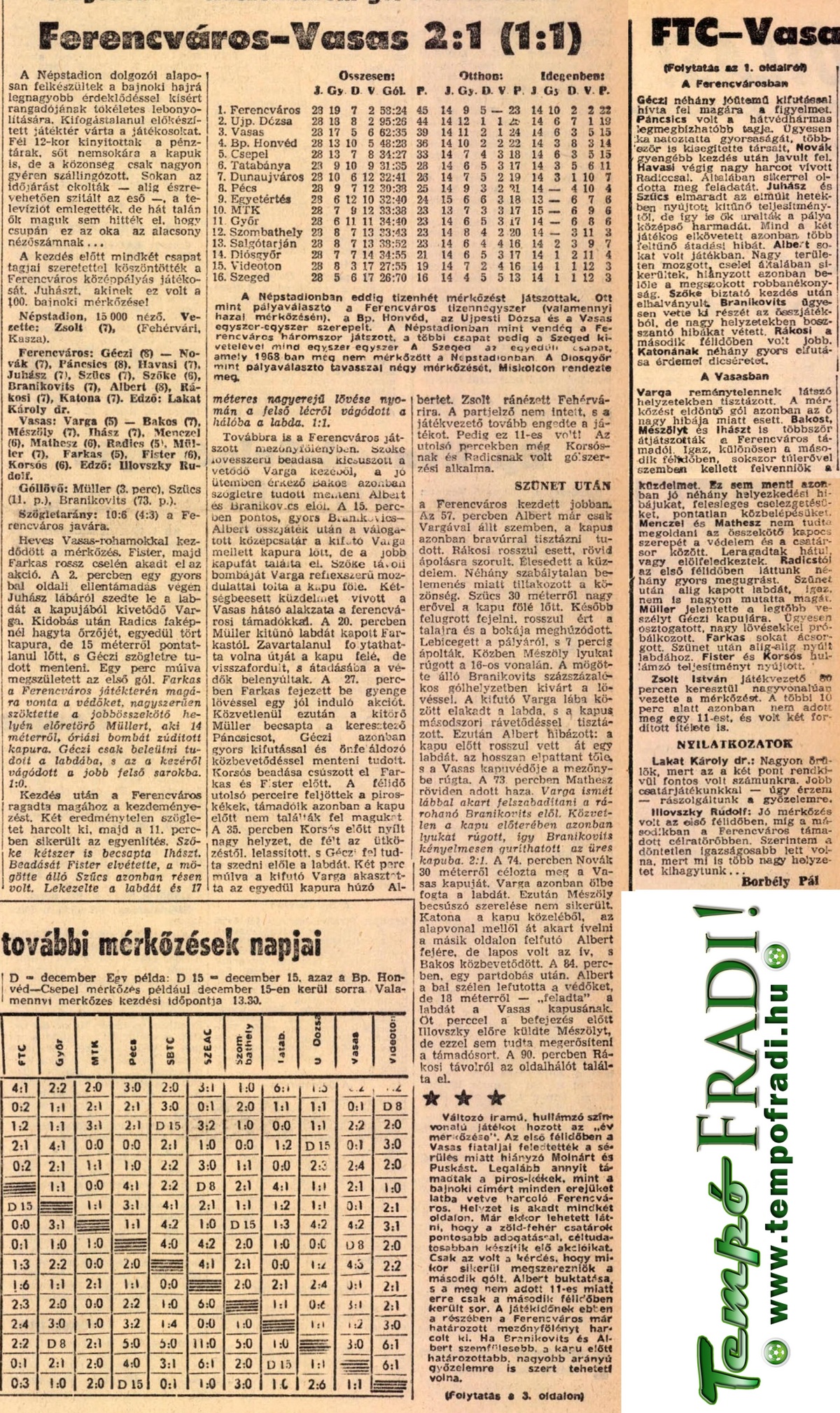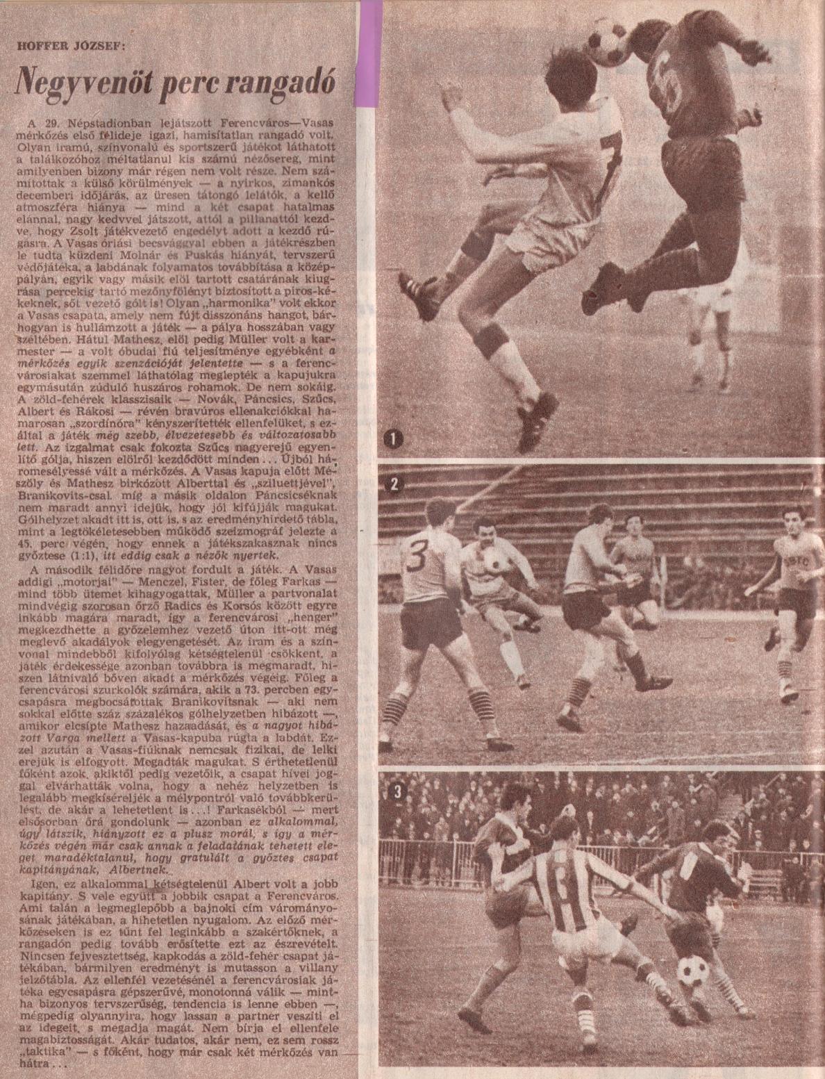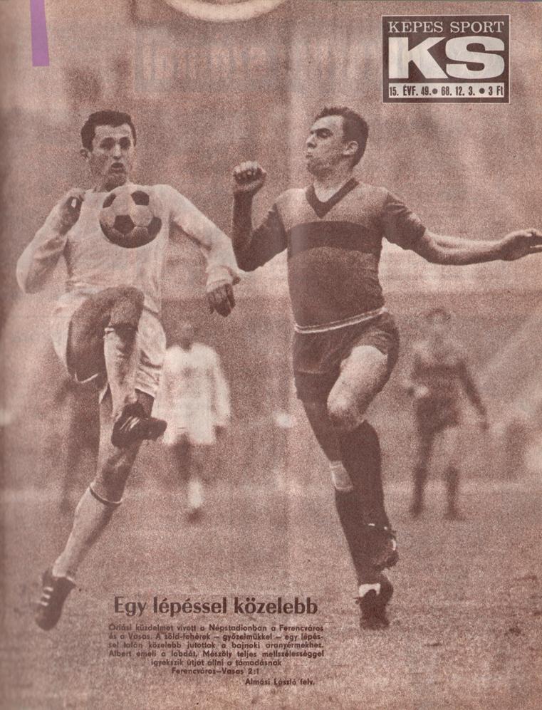 1968. december 1-ig 52 tétmérkőzést játszott a csapat, köztük olyan sorozatban jutottunk a döntőig, mint a VVK. Elég rossz idő köszöntött decemberre, így csak 15 ezer néző volt kíváncsi a mérkőzésre, mely egy ünnepléssel kezdődött, a 100. Fradi meccsére készülő Juhász Istvánt köszöntötték. Magáról a mérkőzésről sokat nem is írnék, hiszen a Népsport aktuális számában minden fontos dolog elolvasható. A lényeg, hogy győztünk 2:1-re, így megtartottuk az egy pontos előnyünket a Dózsával szemben, és a Vasast végleg leszakítottuk (Kádár János nagy bánatára).