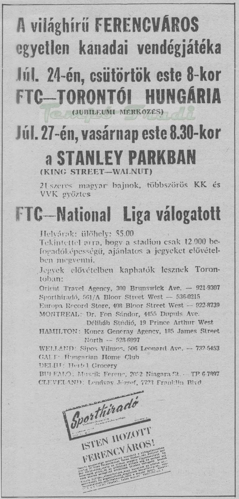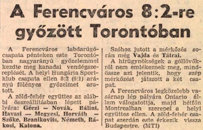 A Ferencváros labdarúgócsapata július 22-én három mérkőzésből álló kanadai portyára utazik. Július 22-én Győrből indul a csapat, s egy nappal később Bécsben ül repülőgépre, hogy Zürichen keresztül Montreálba, majd onnan Torontóba repüljön — mondta Kalmár István, a klub elnöke. — Az érkezés után egy nappal mérkőzik csapatunk a Toronto Hungáriával, három nappal később pedig a torontói ligaválogatottal.